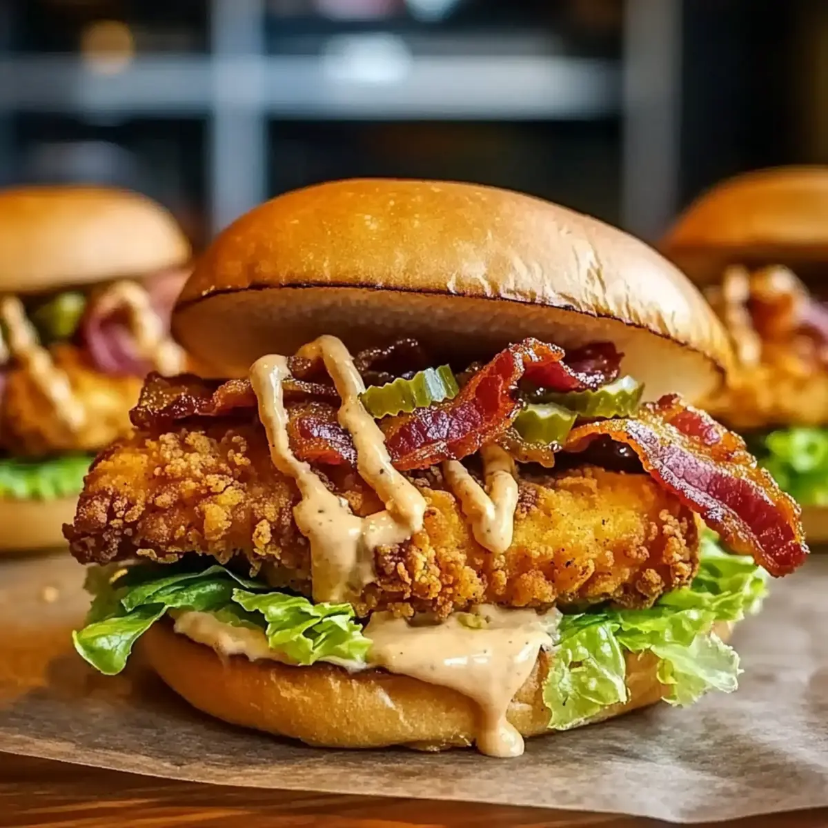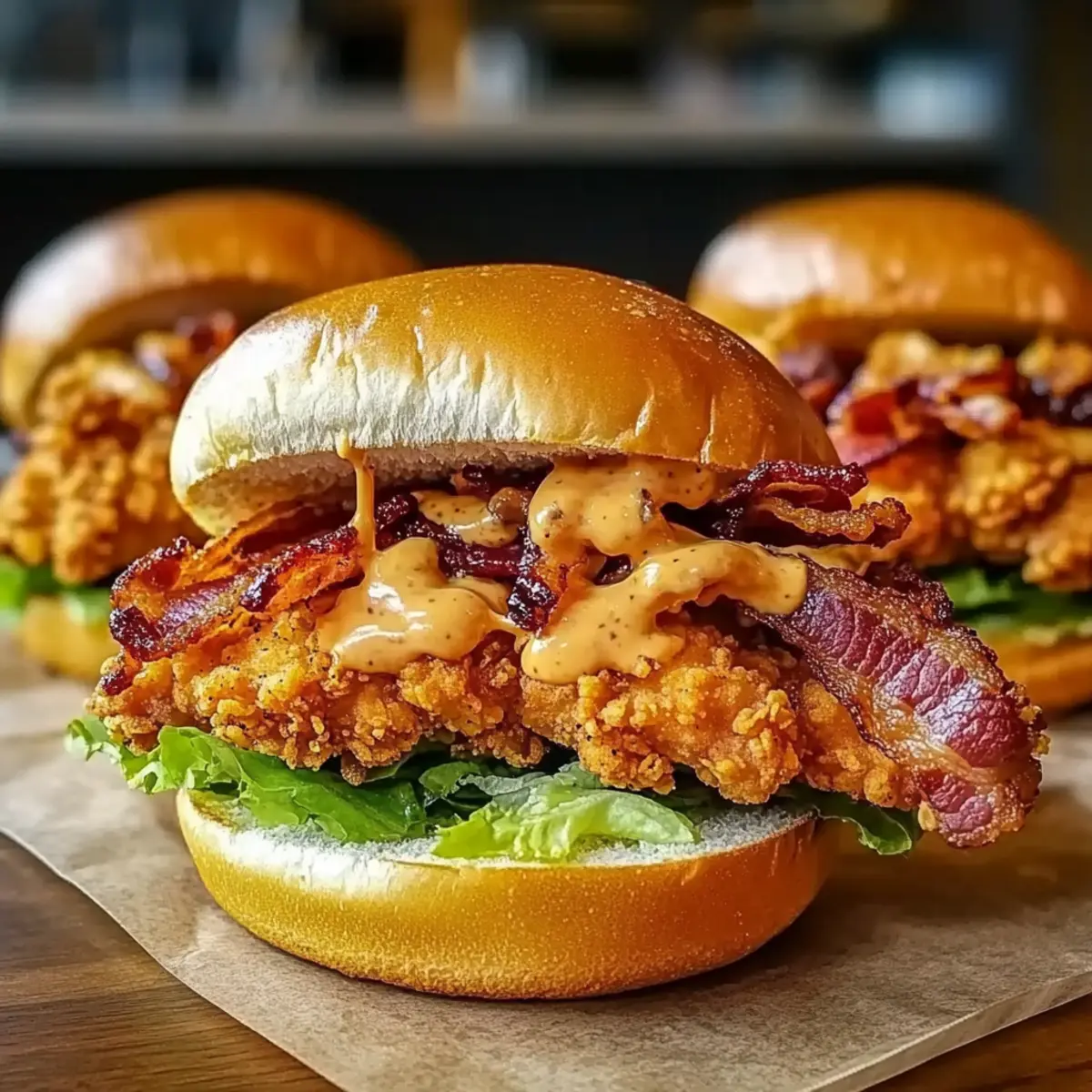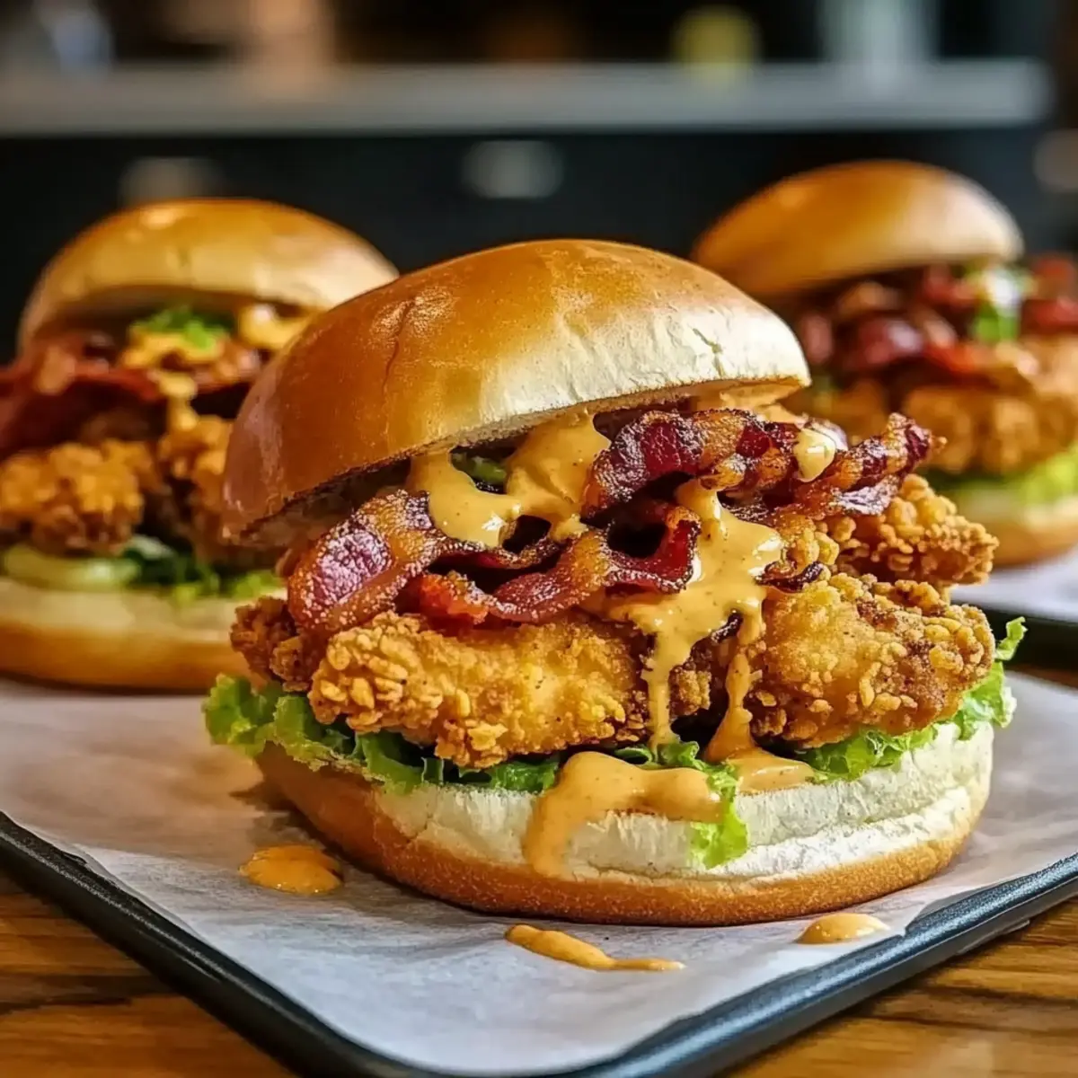 - Assemble the sandwiches by placing a crispy chicken tender in each bun and adding a slice of crispy bacon.