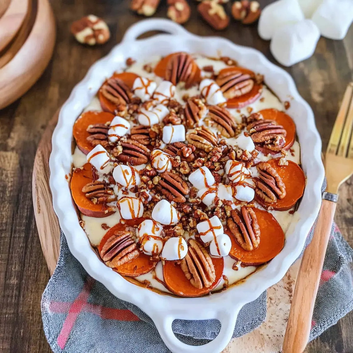 Heavenly Scalloped Sweet Potatoes with Marshmallows & Pecan Crunch