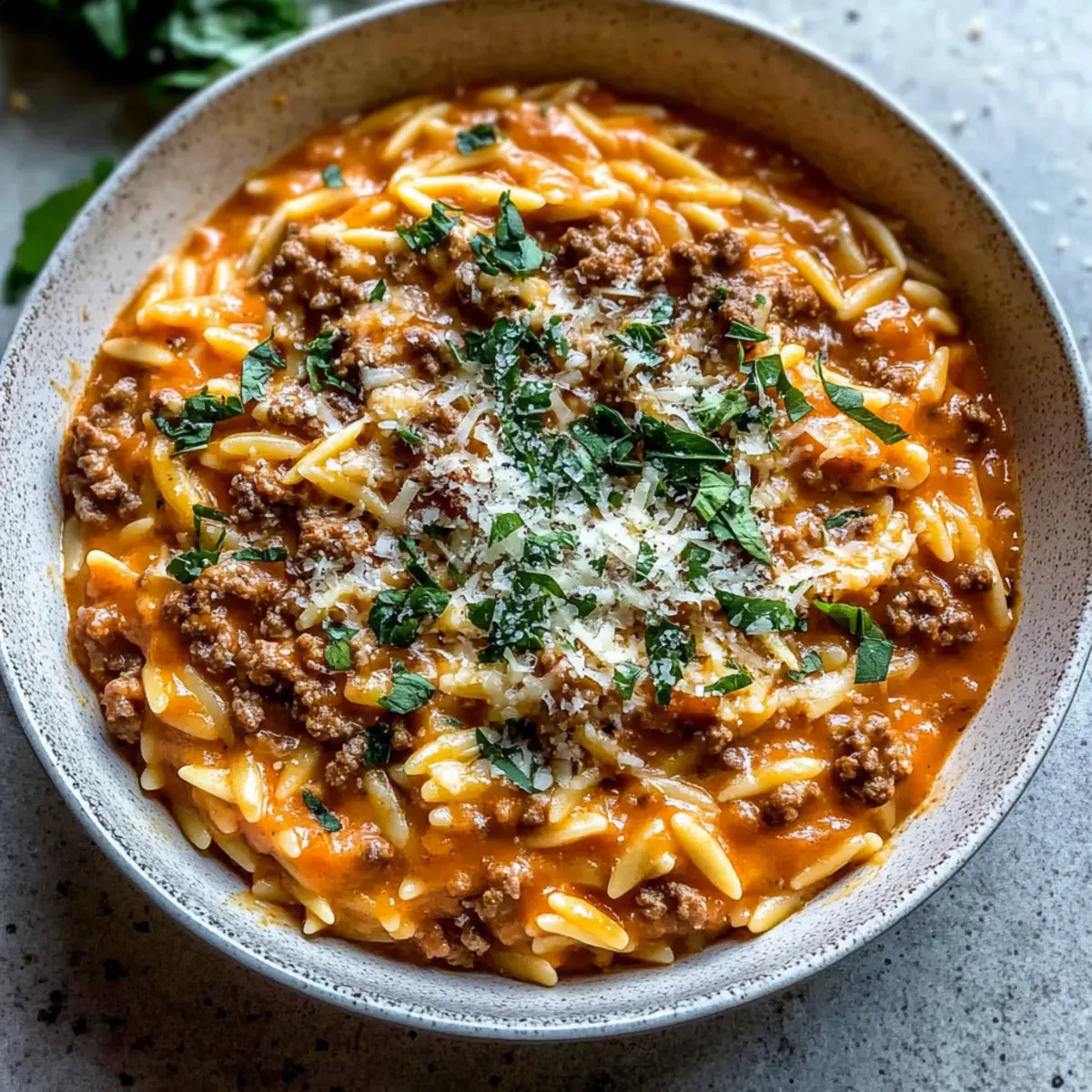 Creamy Ground Beef Orzo with Tomato Sauce & Fresh Basil Bliss