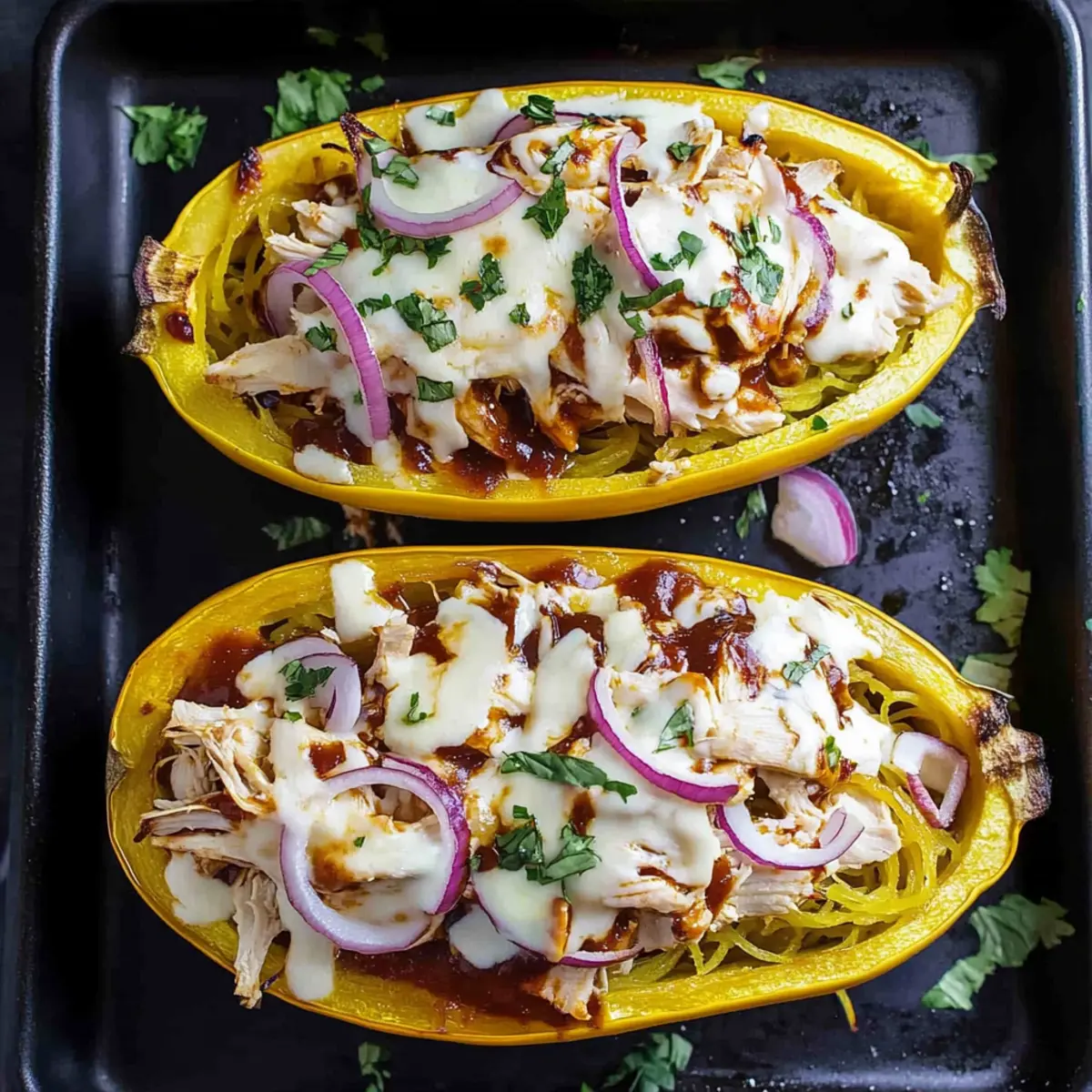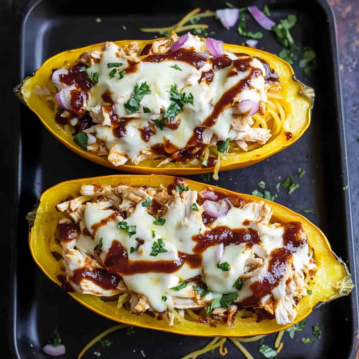 BBQ Chicken Pizza Stuffed Spaghetti Squash for Healthy Cravings