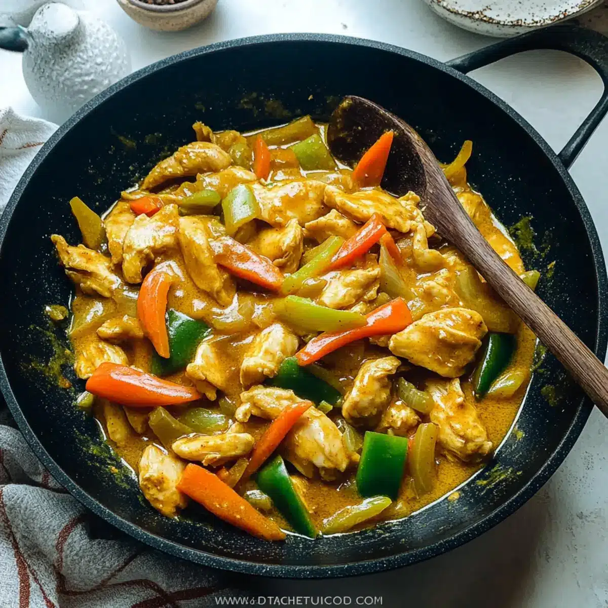 Once boiling, lower the heat to medium-low and add the marinated chicken to the skillet. Stir gently to incorporate, then let the mixture simmer for about 3-5 minutes, until the chicken is fully cooked and tender. The sauce will thicken slightly, coating the chicken beautifully with that signature Chinese Curry flavor.