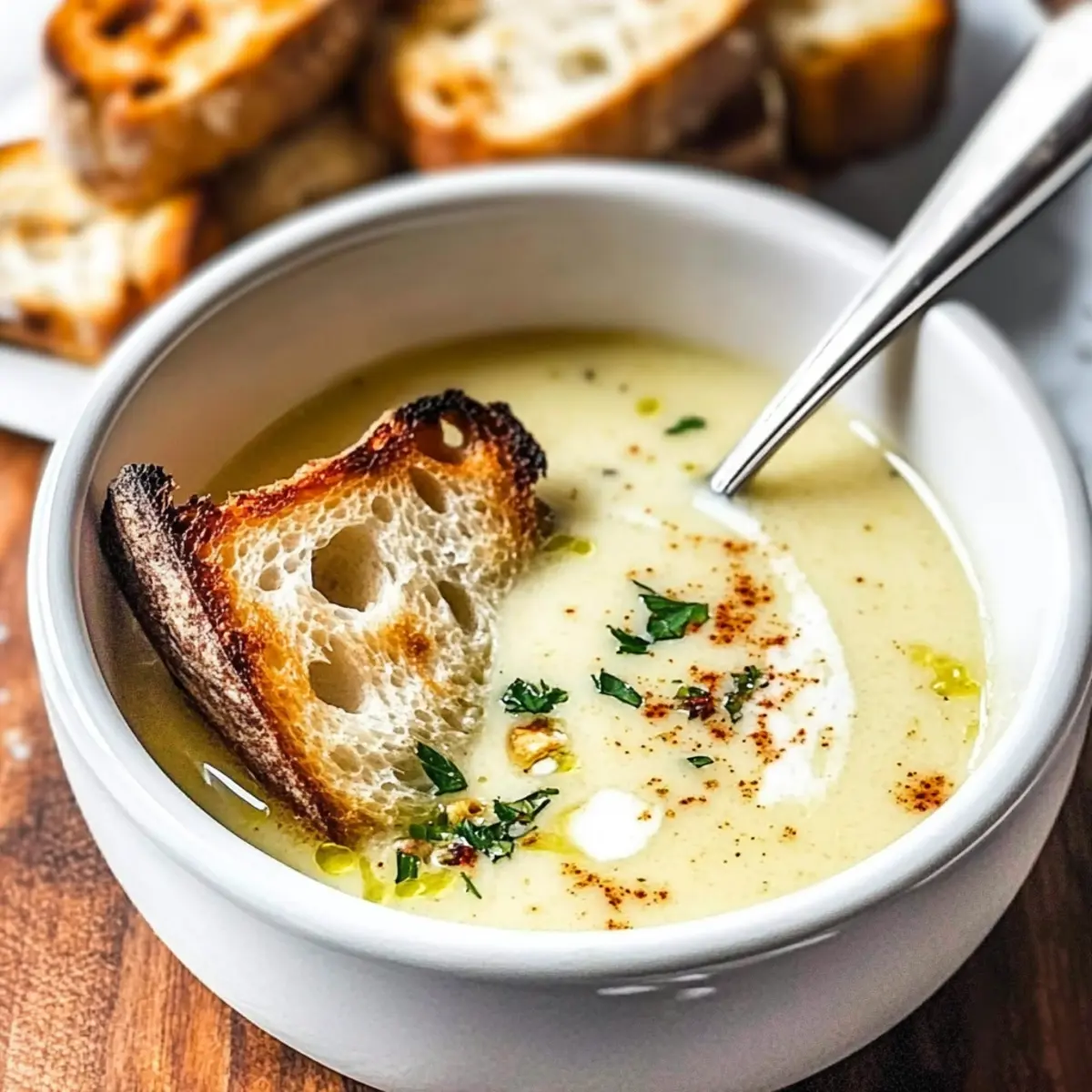 Once warmed through and silky smooth, ladle the soup into bowls. For a delightful finish, garnish with homemade croutons, a drizzle of olive oil, a sprinkle of smoked paprika, and fresh parsley, if desired. Your Country French Garlic Soup is now ready to warm both hearts and bodies!