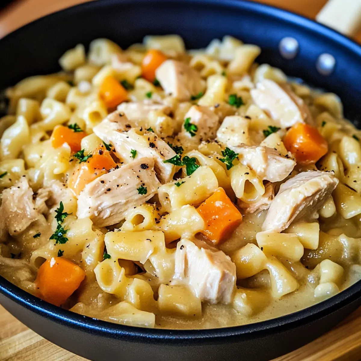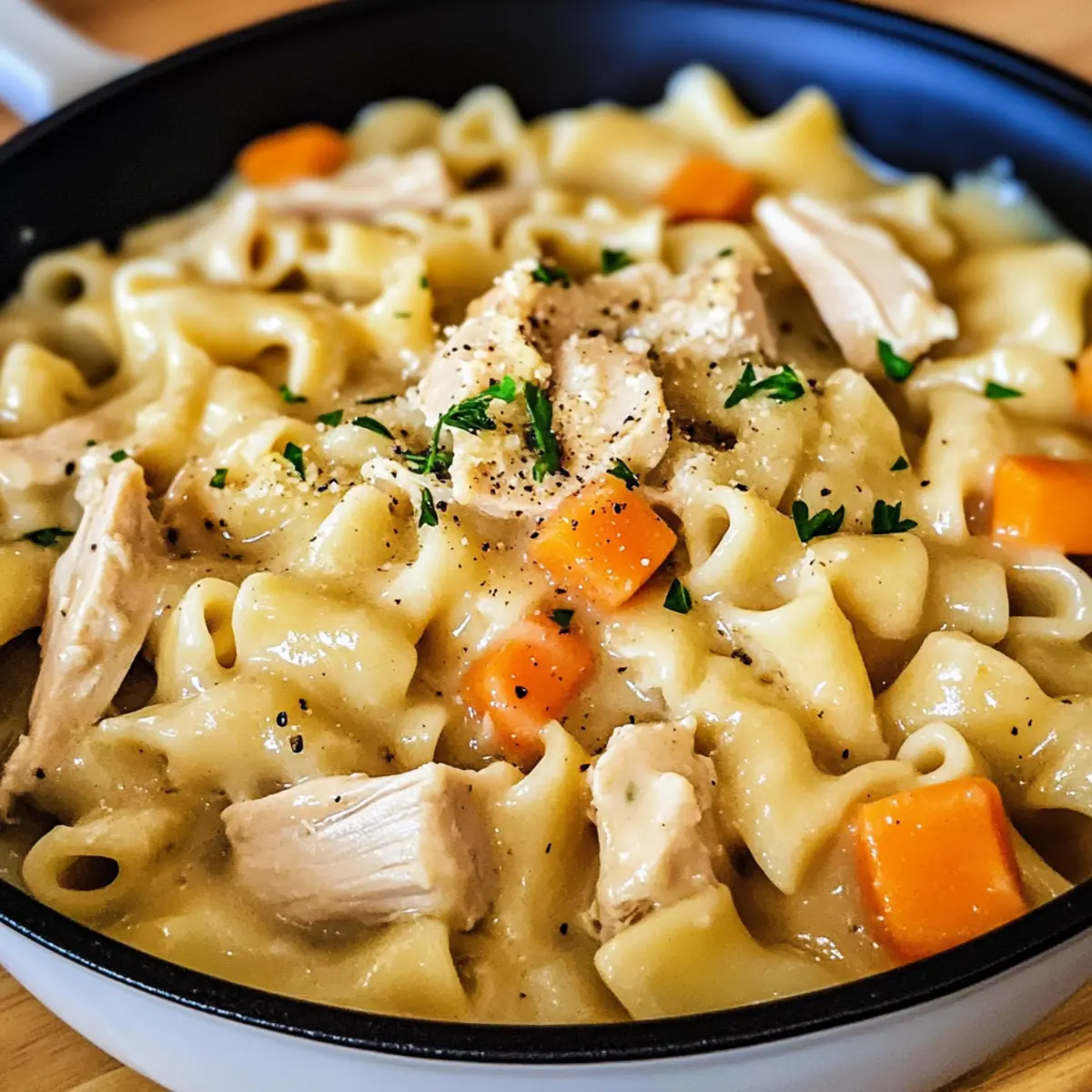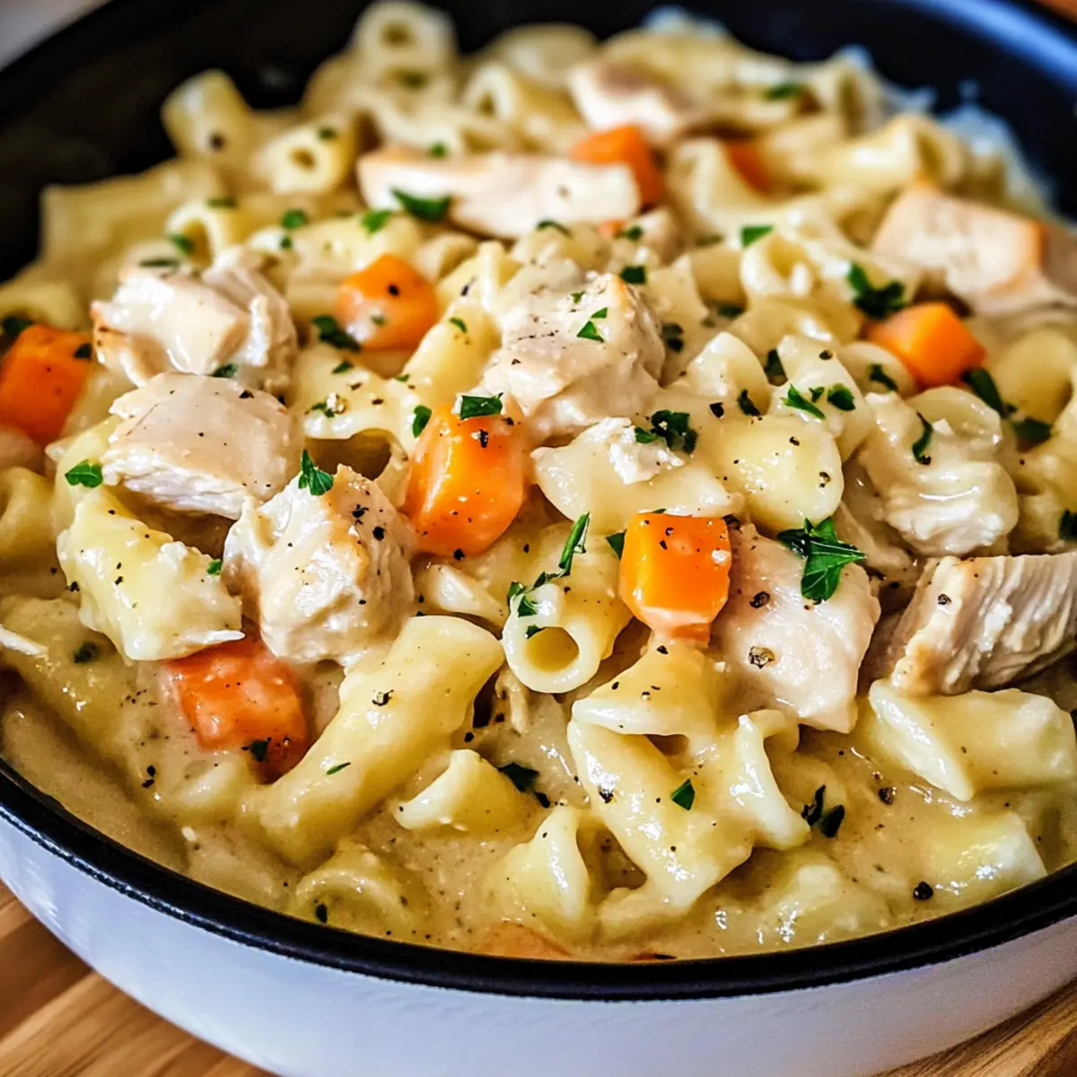 Creamy Goodness: Hearty egg noodles coated in a velvety sauce guarantee flavors that embrace your palate, reminiscent of a classic chicken pot pie.