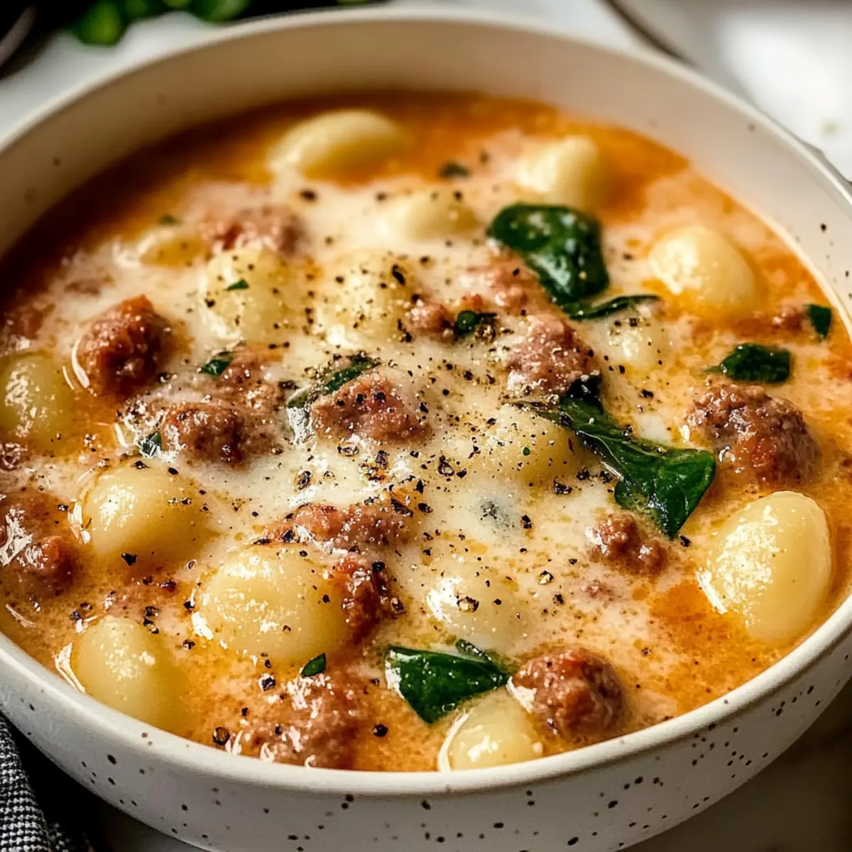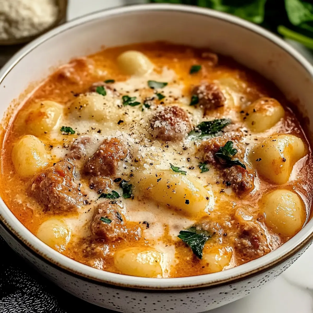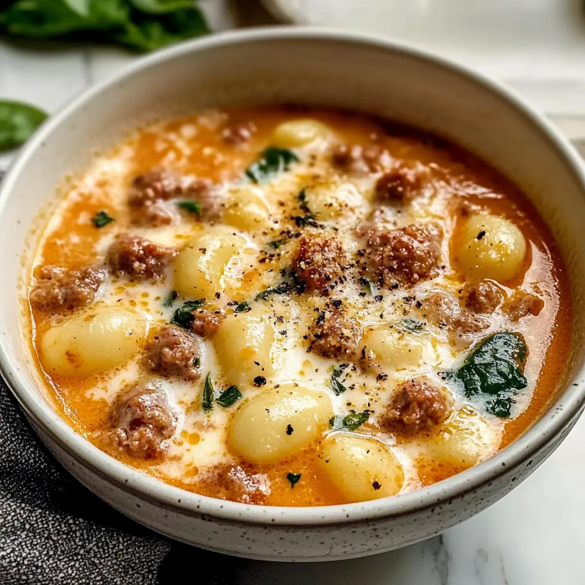 Finish with Freshness: Top your soup with fresh basil or spinach right before serving. This not only adds color, but also a burst of freshness to the Creamy Italian Sausage Gnocchi Soup.