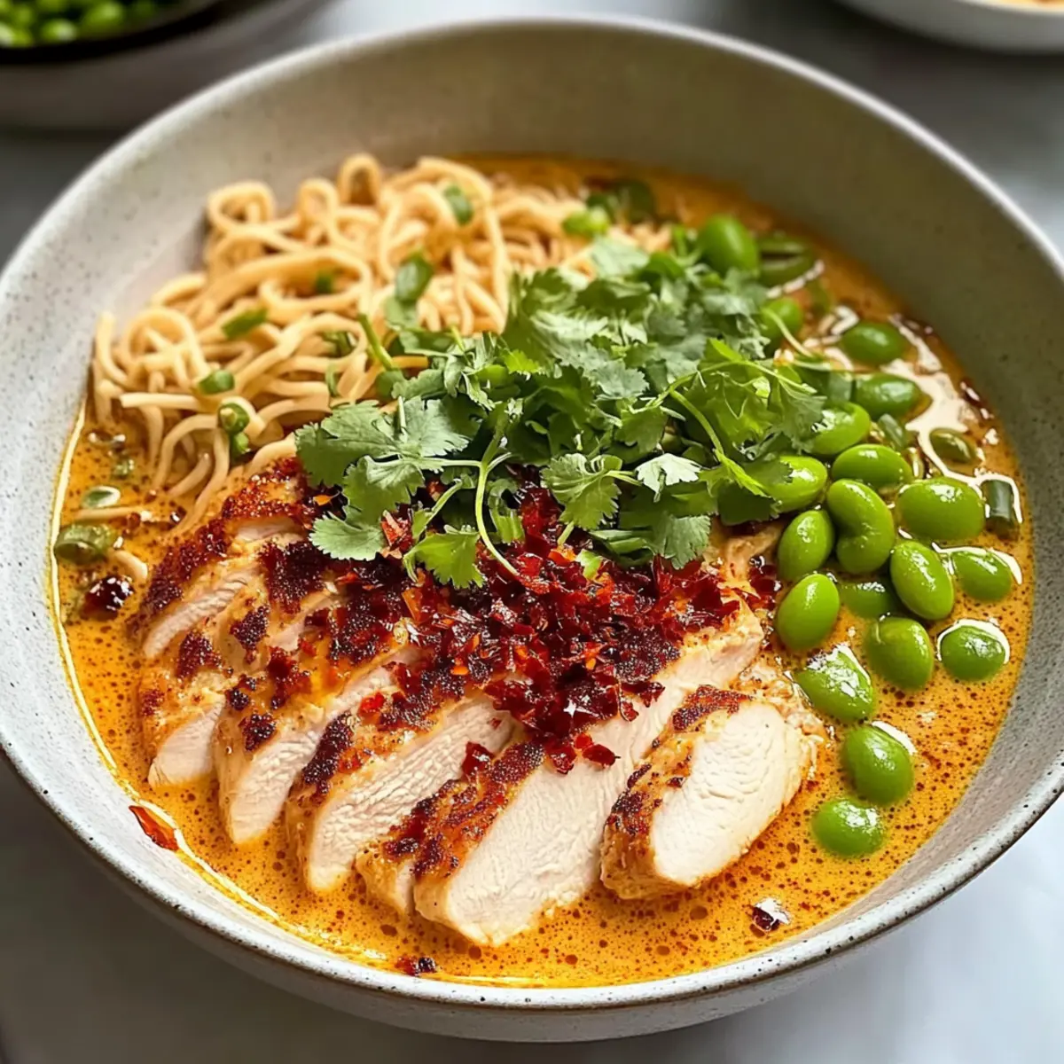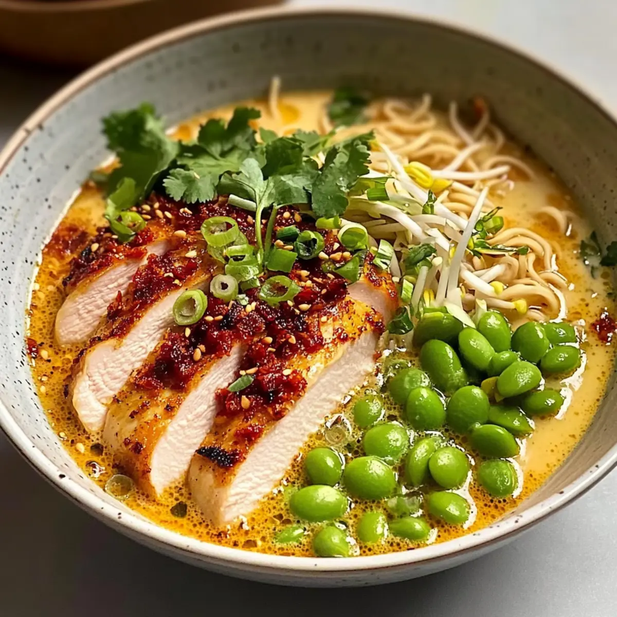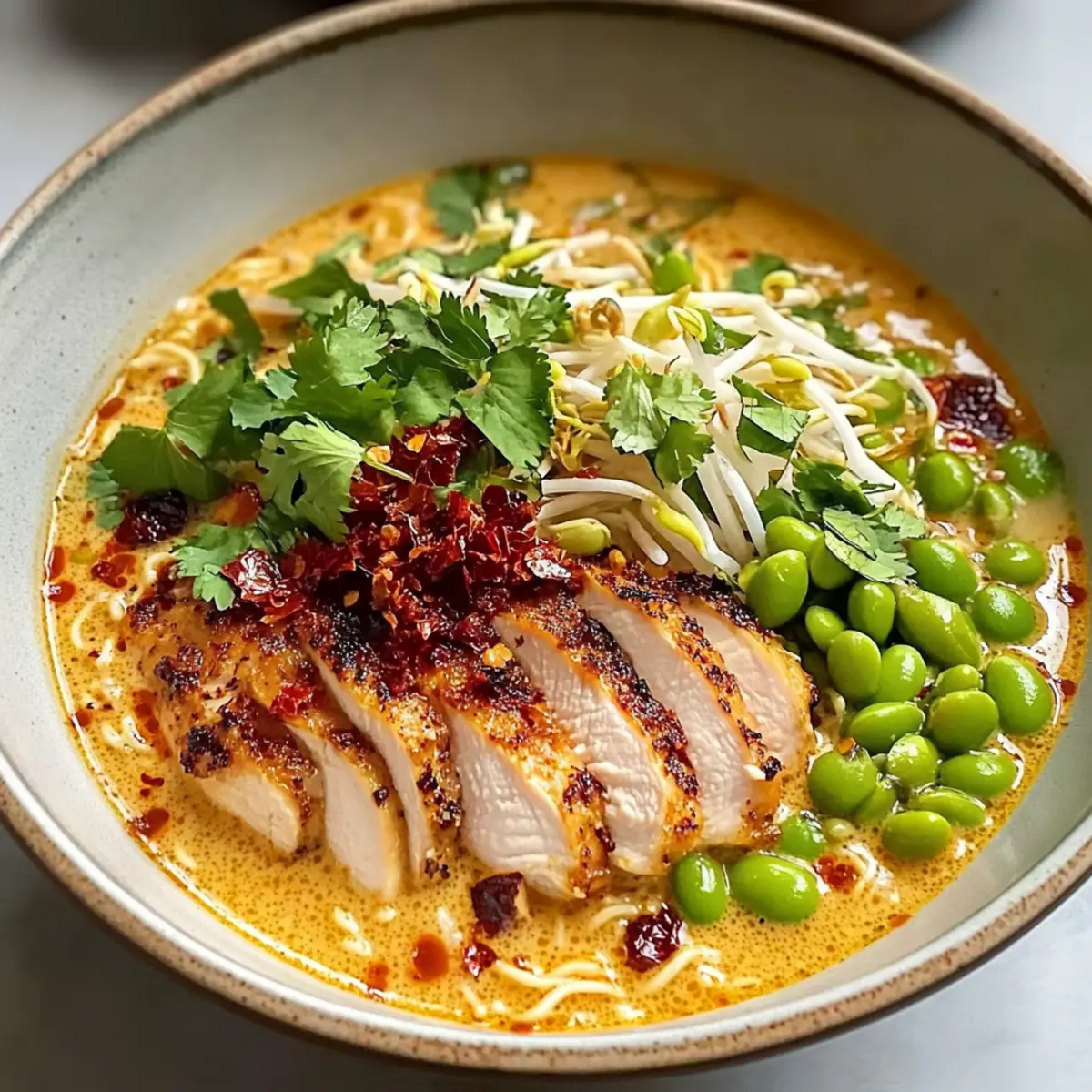 Divide the ramen and broth among bowls, ensuring each portion gets enough creamy broth. Top each bowl with the sliced chicken, and finish with fresh cilantro, bean sprouts, and edamame. If desired, sprinkle with scallions and drizzle a bit of chili oil for extra flavor. Your Creamy Marry Me Chicken Ramen is now ready to impress!