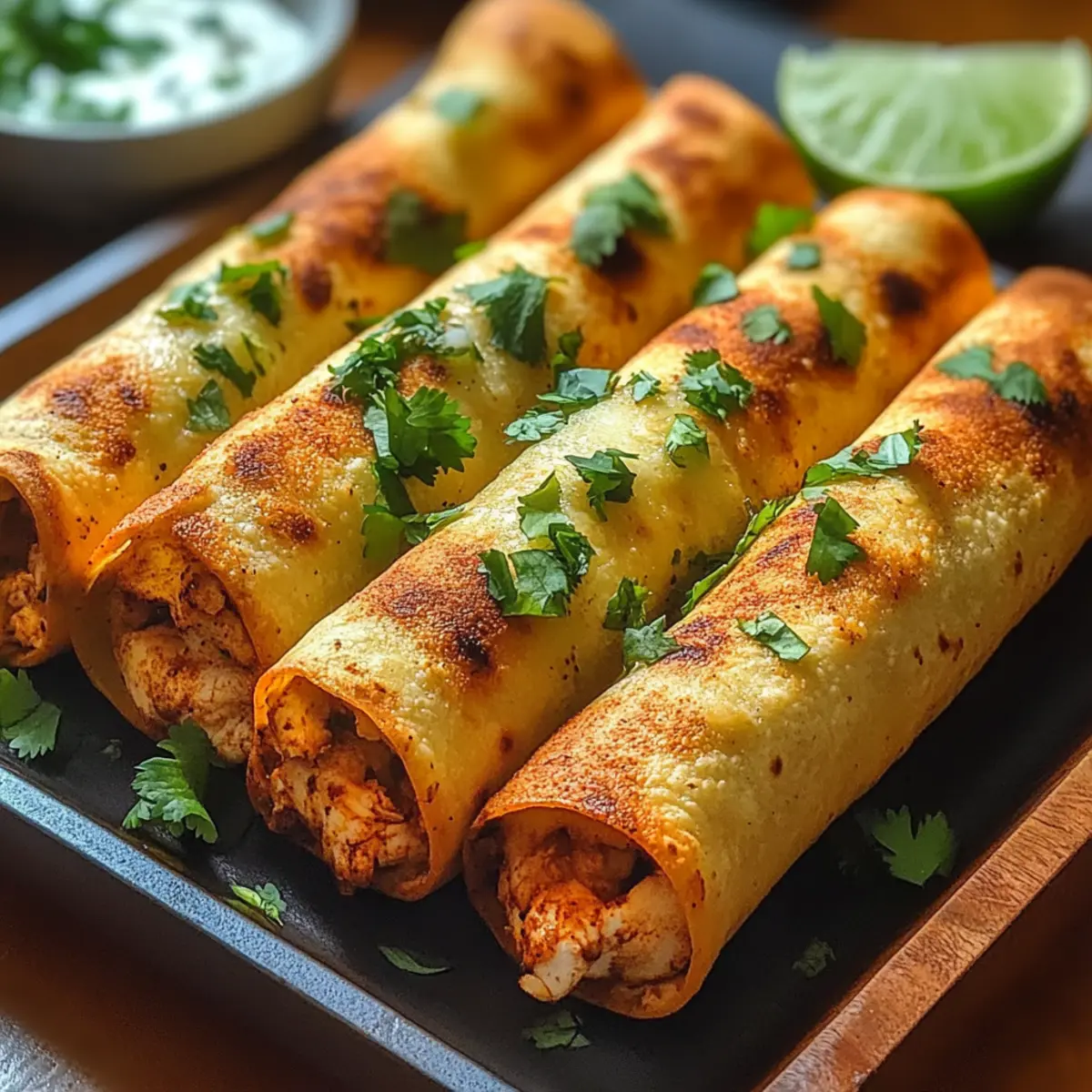 Once your taquitos are perfectly baked and crispy, remove them from the oven and let them rest for a few minutes. Plate them up, drizzling the crema over the top or serving it on the side for dipping. Garnish with extra cilantro and lime wedges for that bright finishing touch, and get ready to delight in this delicious treat!