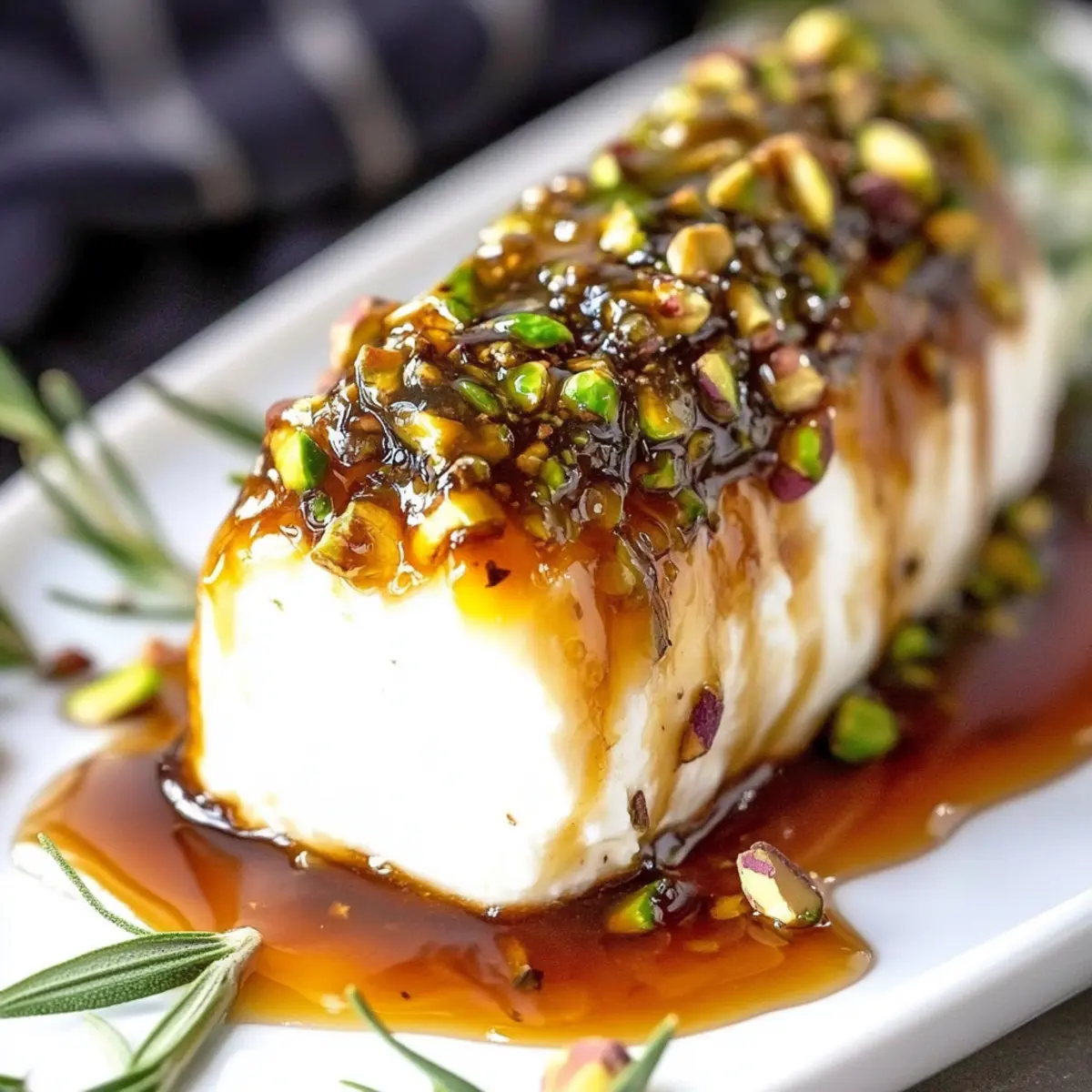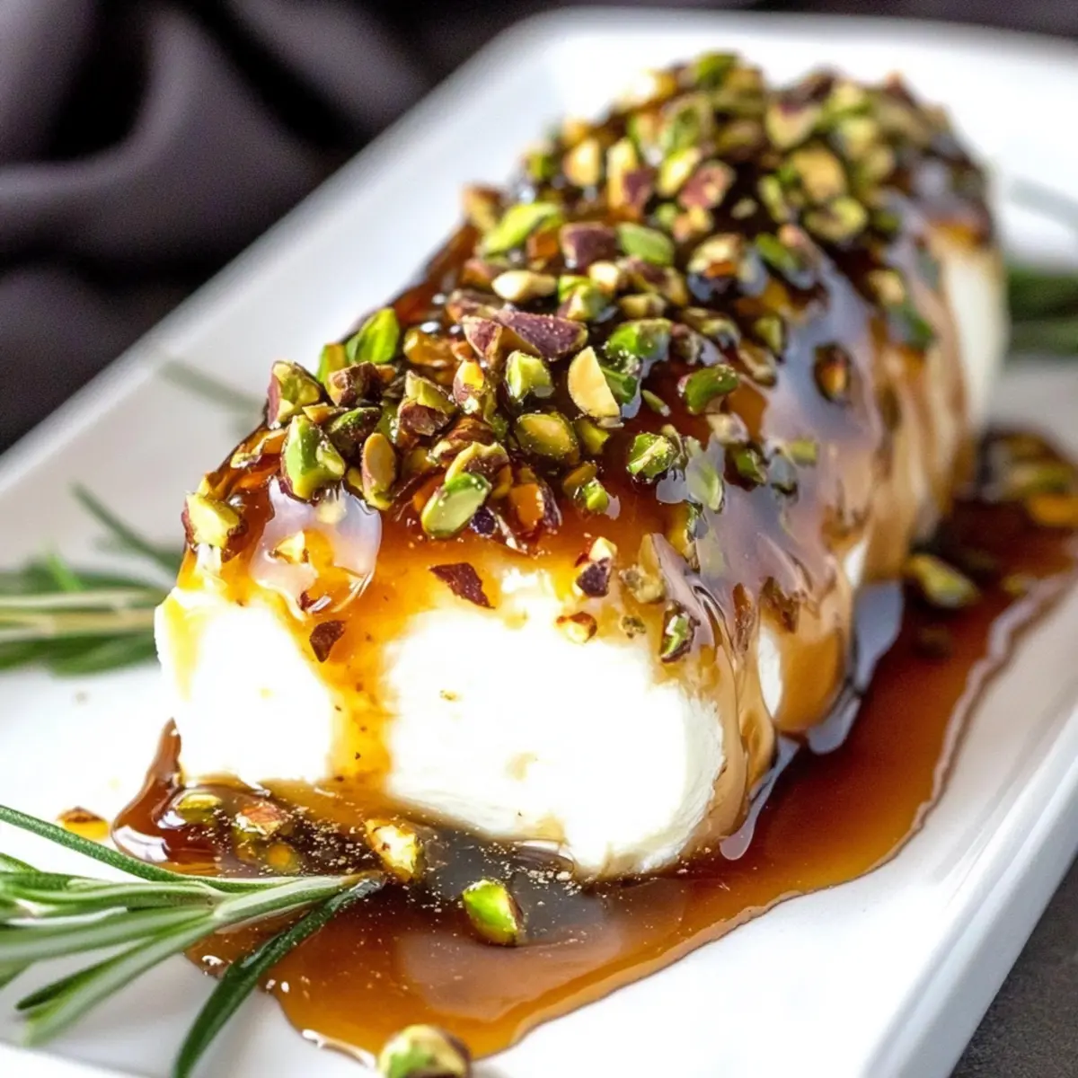 - Roll the goat cheese log in the chopped pistachios, pressing lightly to coat.