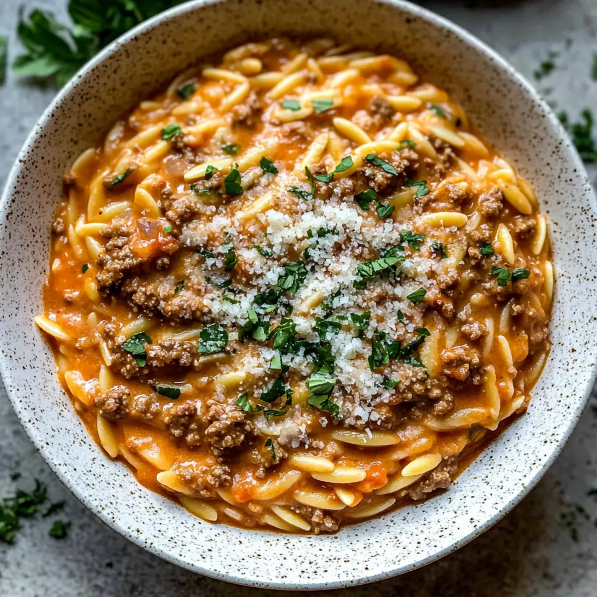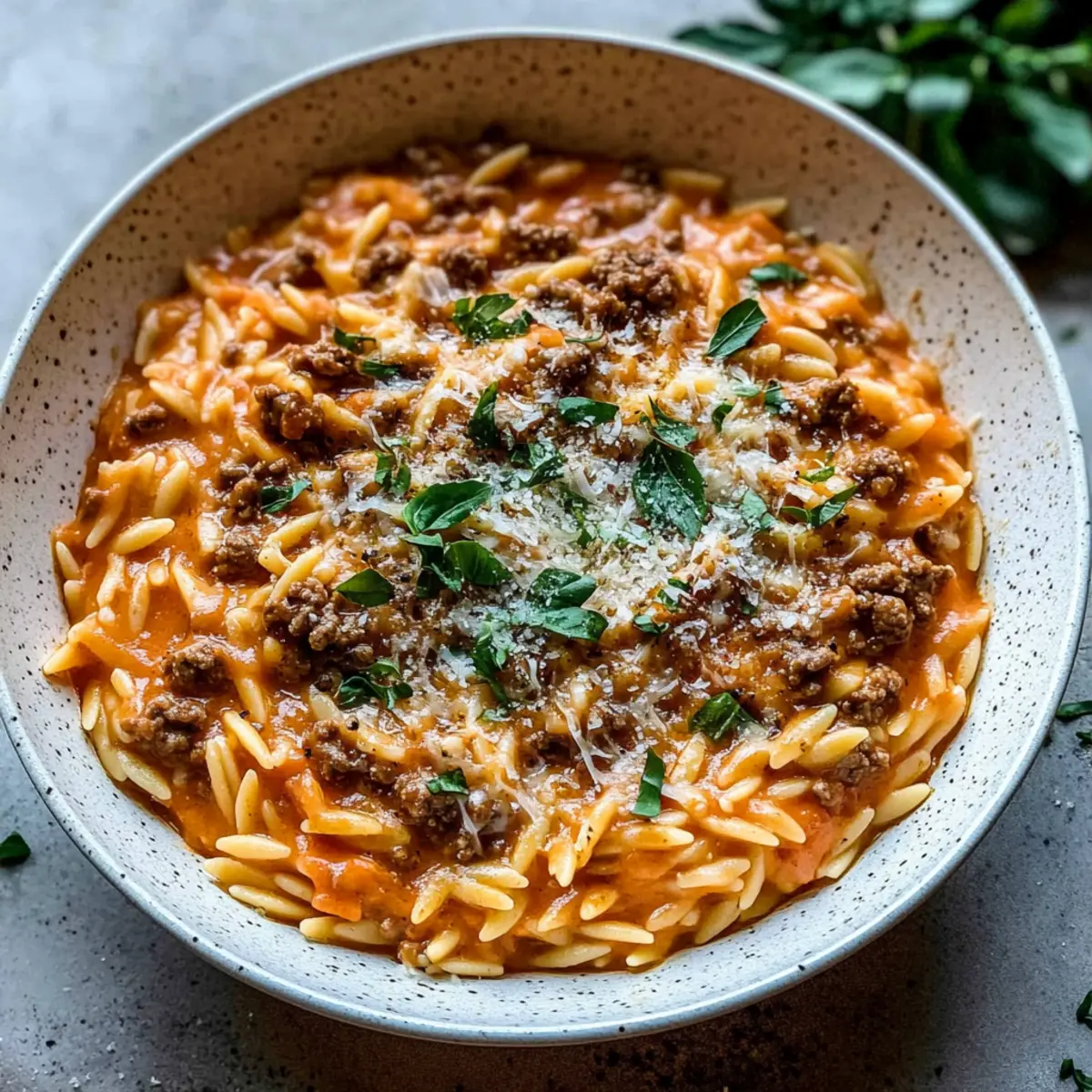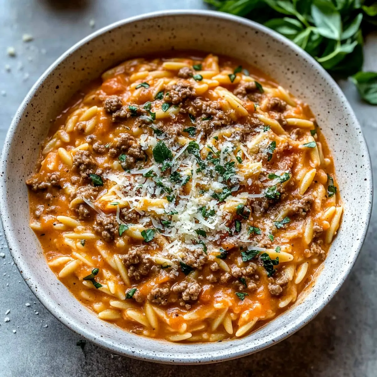 Creamy Ground Beef Orzo with Tomato Sauce & Fresh Basil Bliss