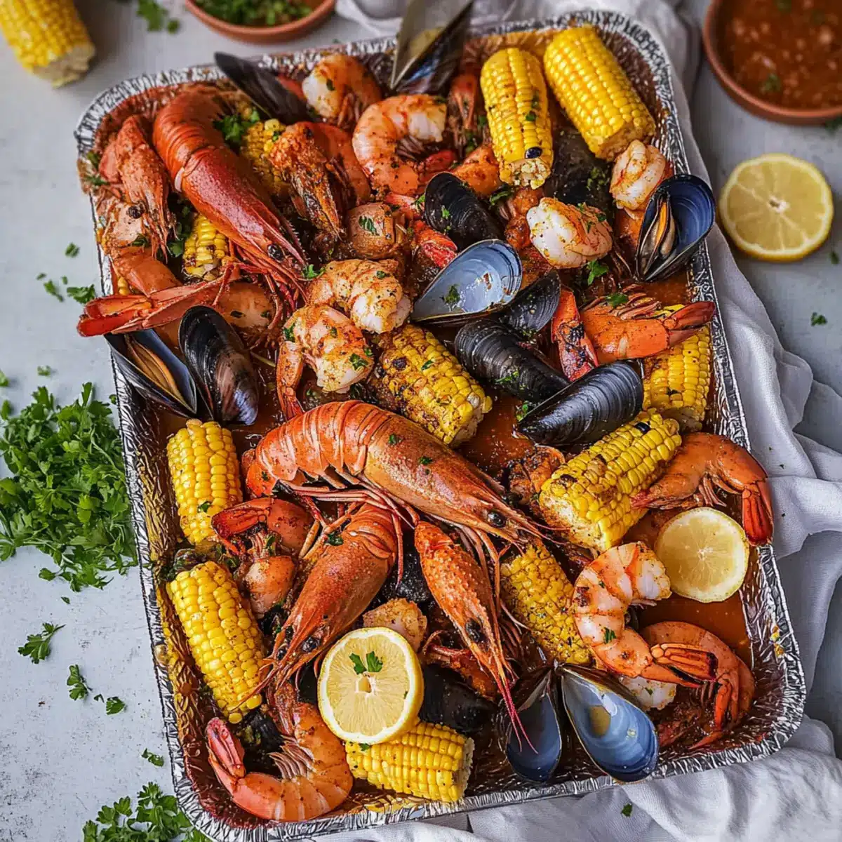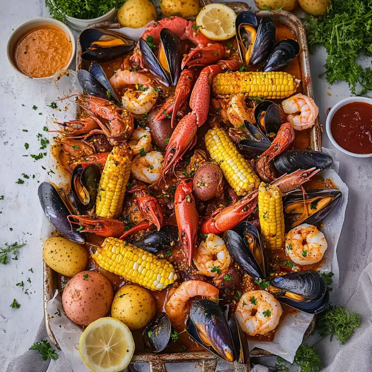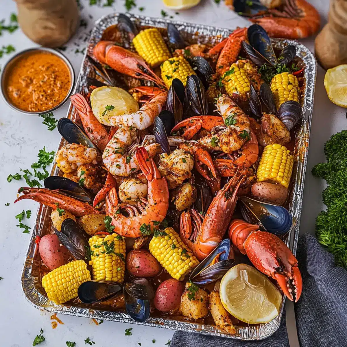 Ready to feast? Carefully pour the seafood and vegetables onto a newspaper-lined baking sheet for a festive presentation. Drizzle generously with your spicy garlic butter sauce, and garnish with freshly chopped parsley and extra lemon wedges for brightness. Gather around the table and dig in—this homemade Cajun seafood boil is meant to be shared!