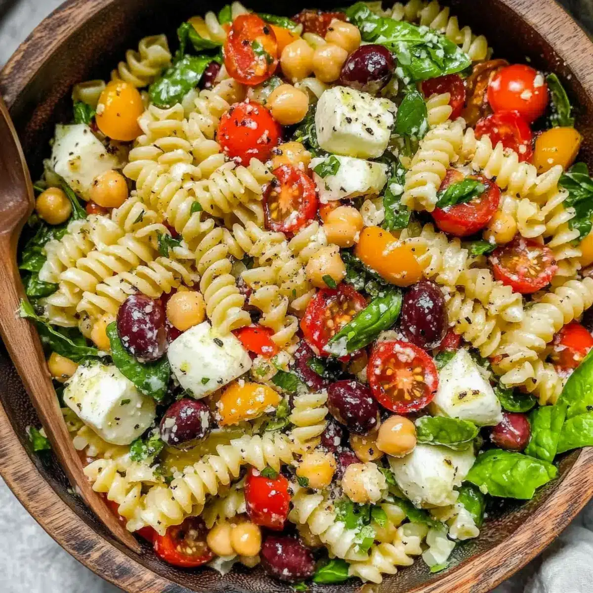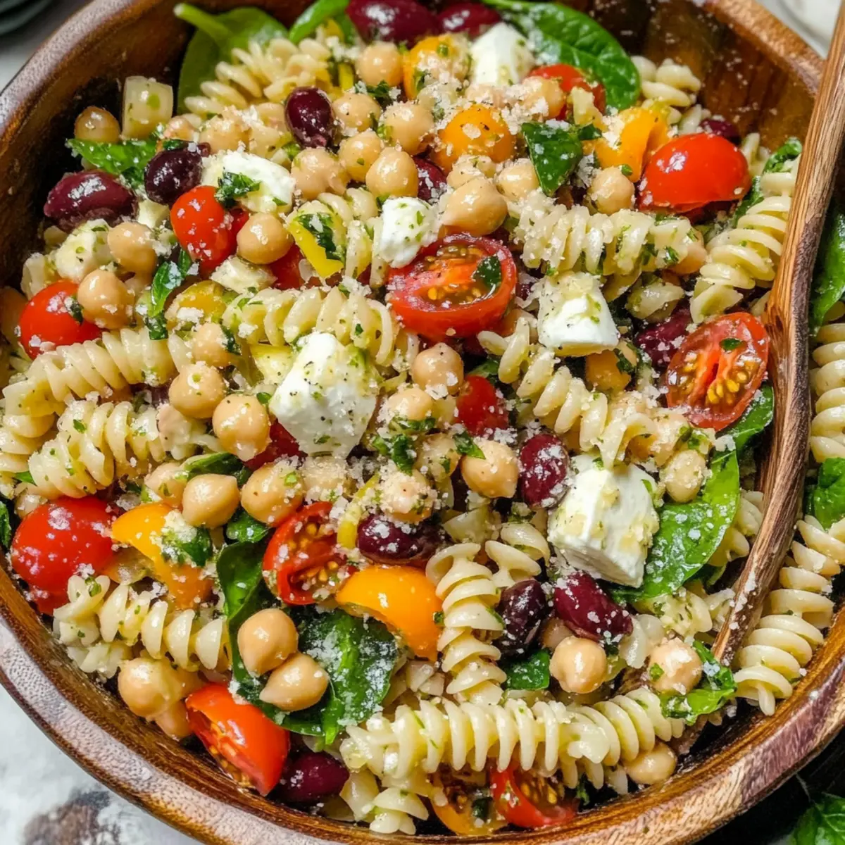 - Combine cooled pasta, chickpeas, cherry tomatoes, mini sweet peppers, spinach, pepperoncini, Kalamata olives, and cheeses in a large mixing bowl.