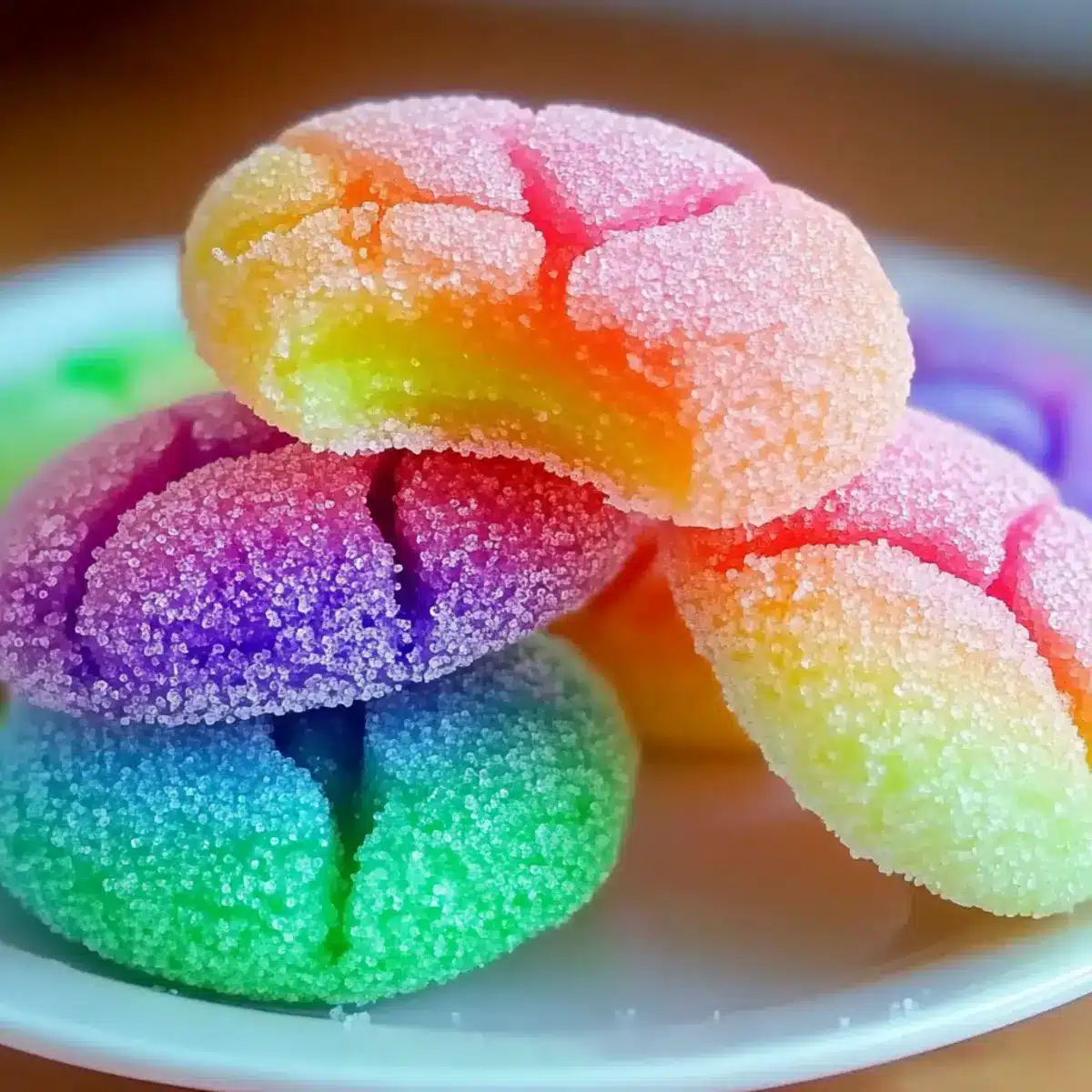 After chilling, remove the dough from the refrigerator. Scoop out tablespoon-sized portions and roll them into balls. Next, roll each ball in additional granulated sugar for a sweet crust, then flatten them slightly with your palm. This will help create the perfect texture for your colorful treats!