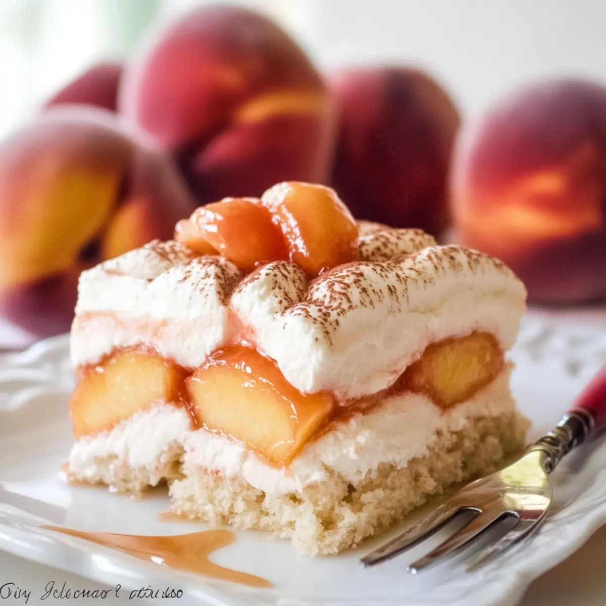 When it’s time to indulge, take your chilled Peach Tiramisu out of the refrigerator. Use a sharp knife to cut it into squares, revealing the beautiful layers inside. Serve each piece with a drizzle of fresh peach syrup and, if desired, a dollop of the reserved peach pieces. This refreshing Peach Tiramisu is the ideal dessert to brighten up your summer gatherings!