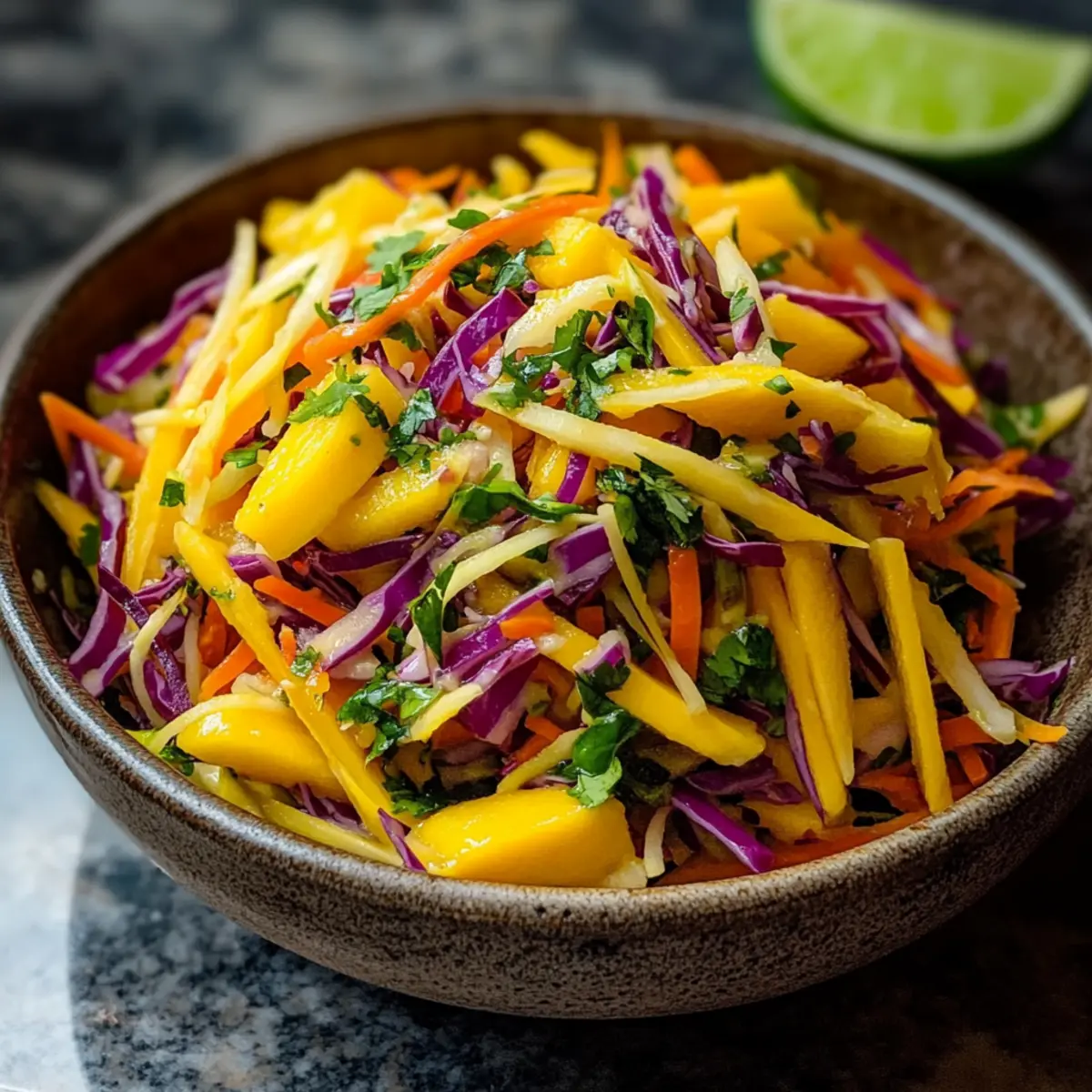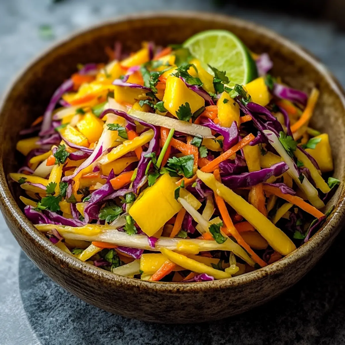Bursting with color: This slaw is a feast for the eyes, showcasing vibrant mangoes, crunchy veggies, and a pop of green from fresh cilantro.