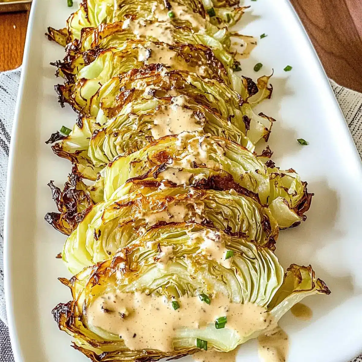 After the cabbage has achieved a beautiful golden-brown exterior, remove it from the oven and transfer the wedges to a serving platter. Give the sauce one final whisk to ensure it’s well combined, then drizzle it generously over the hot roasted cabbage. For a pop of color and fresh flavor, sprinkle chopped chives or parsley on top as a finishing touch, making this easy roasted cabbage dish truly stand out.