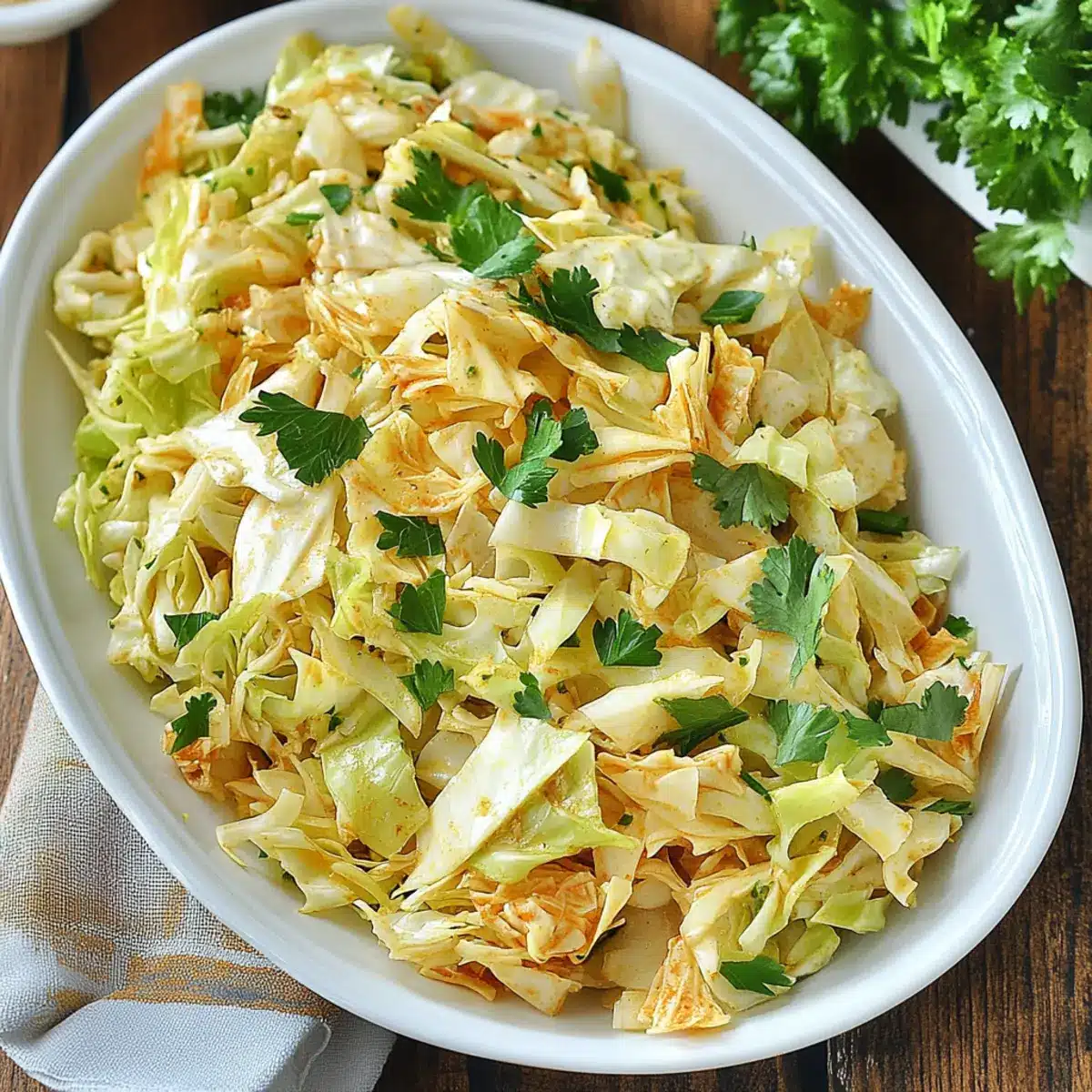 Transfer the dressed cabbage salad to a serving dish. Before serving, garnish with a handful of chopped parsley for a pop of color and freshness. This delightful salad can be enjoyed right away at room temperature or chilled for a refreshing taste, making it a versatile addition to your table.