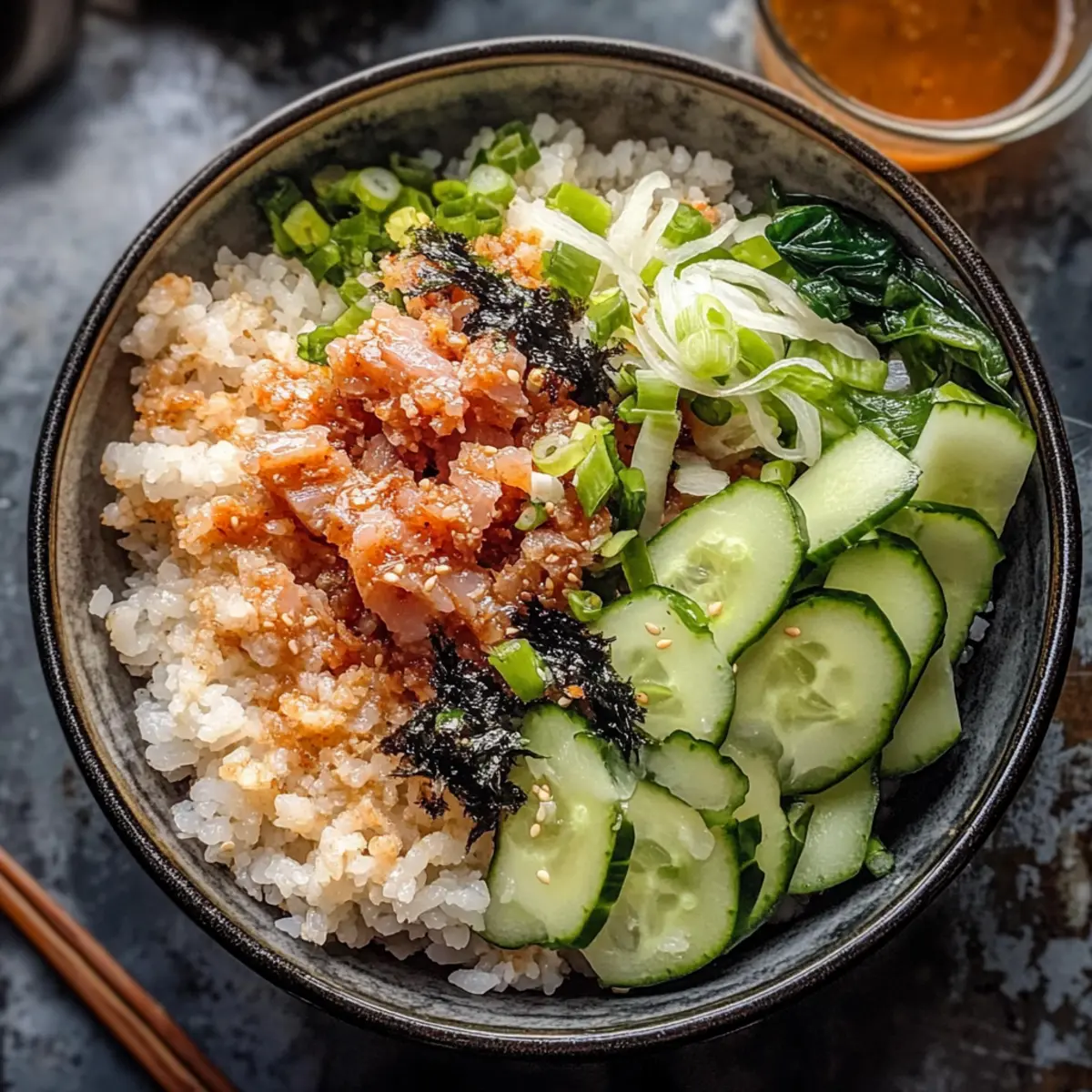 In a serving bowl, start with a generous layer of your golden crispy rice as the base. Add a scoop of the flavorful spicy tuna mixture on top, allowing the vibrant colors to shine through. Next, layer sliced cucumber for a refreshing crunch, and finish the assembly with finely sliced scallions, a sprinkle of sesame seeds, and a drizzle of chili crisp for an extra kick. Your Spicy Tuna Sushi Bowl is now ready to shine!