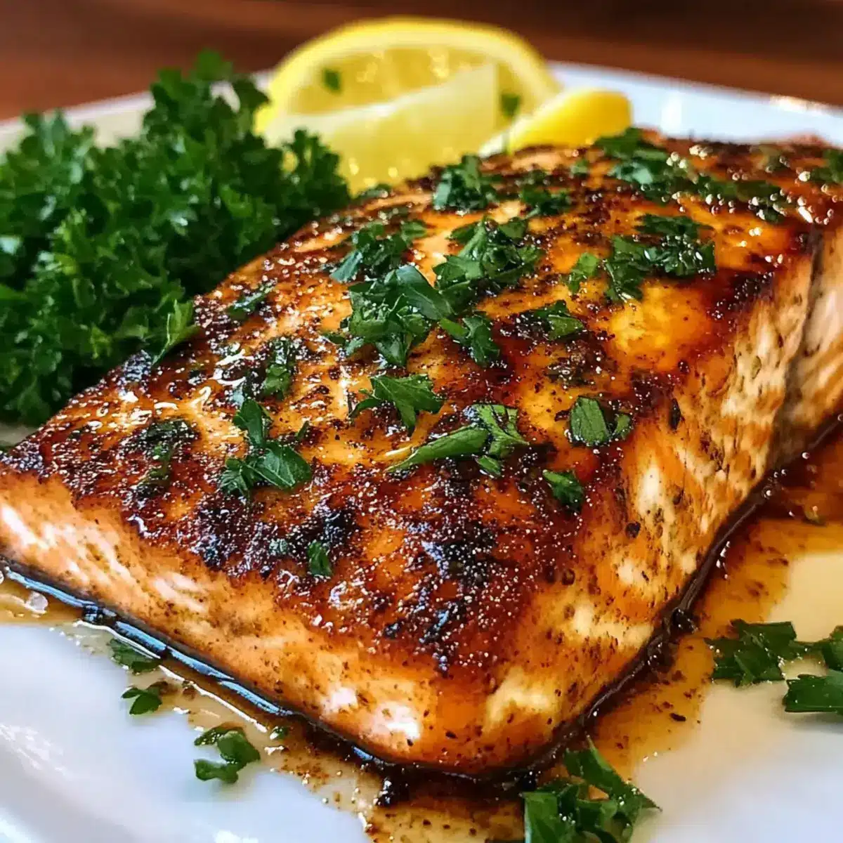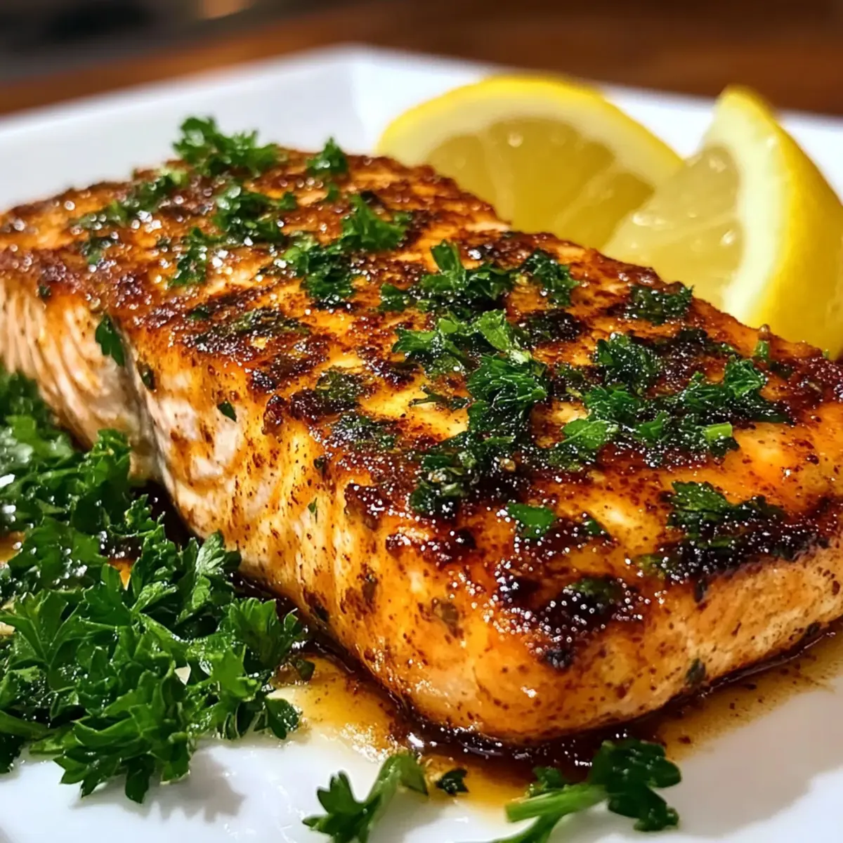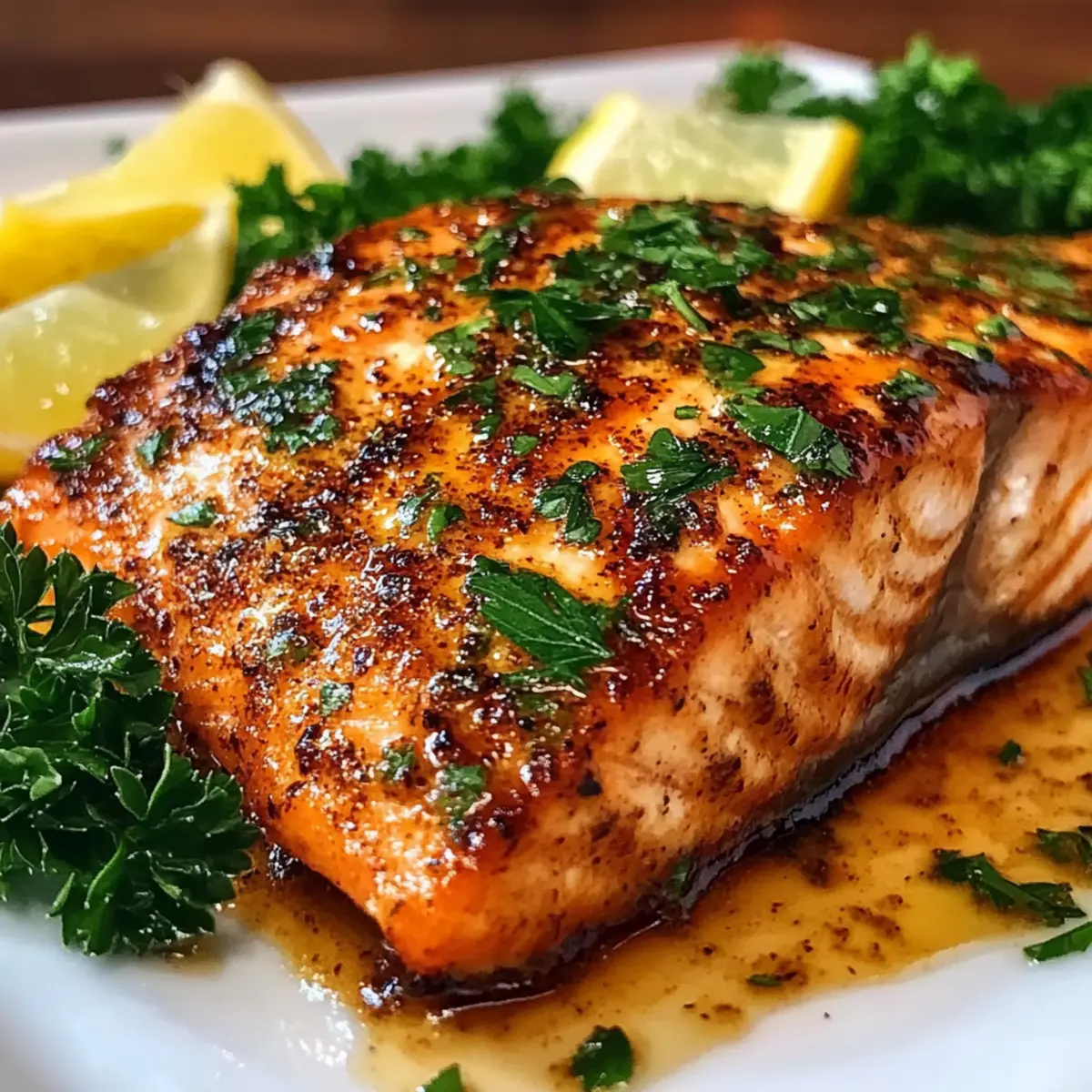 - Garnish the salmon with freshly chopped parsley and serve with lemon wedges on the side.