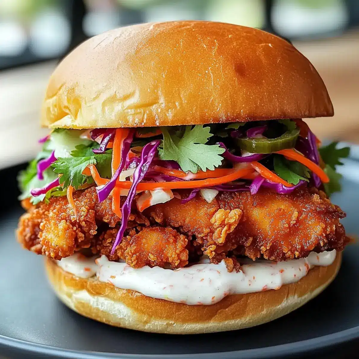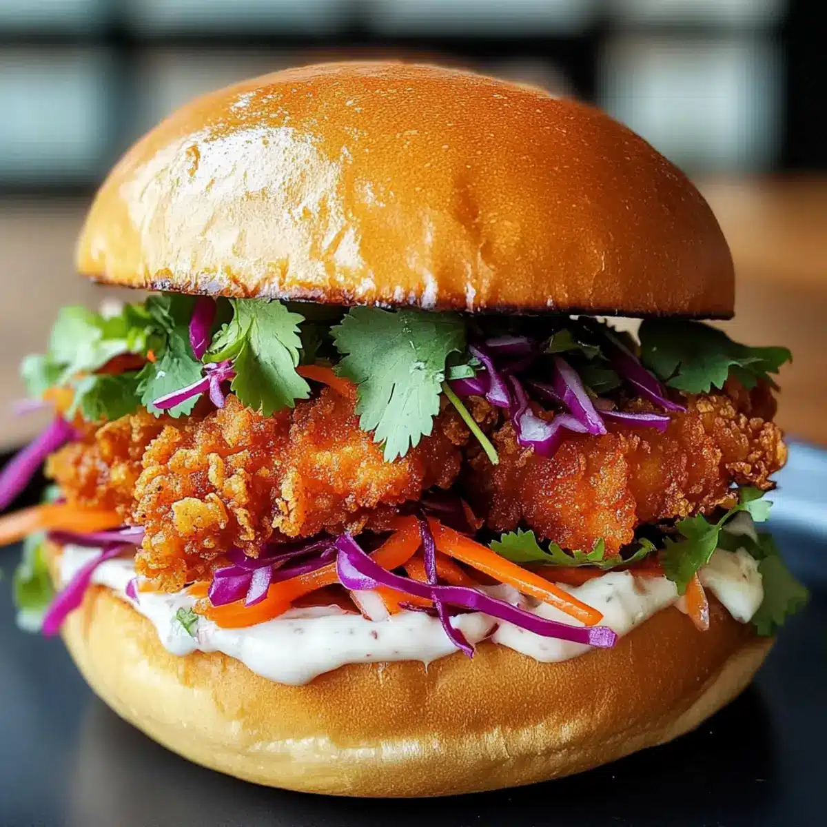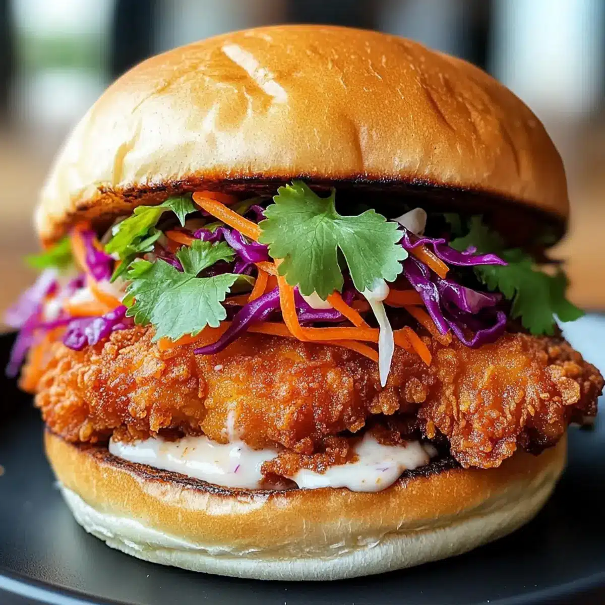 Spread the spicy mayo generously on both halves of the toasted brioche buns. Place a piece of the crispy fried chicken on the bottom half, then layer with shredded cabbage, pickled carrots, and a sprinkle of fresh cilantro for added flavor and crunch. Top with the other half of the bun and prepare to enjoy your masterpiece!