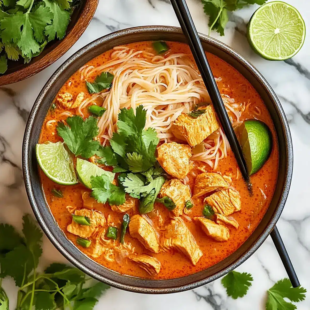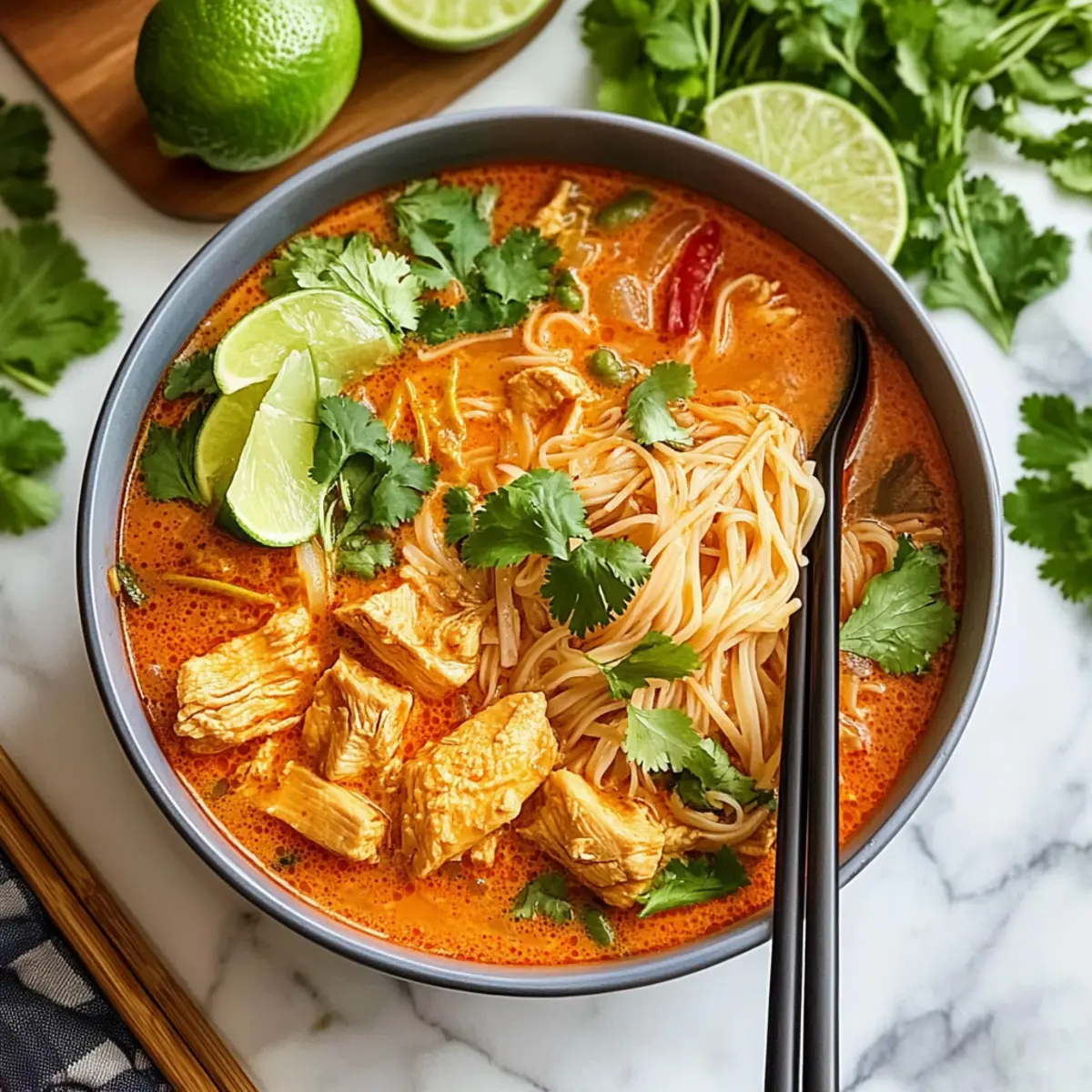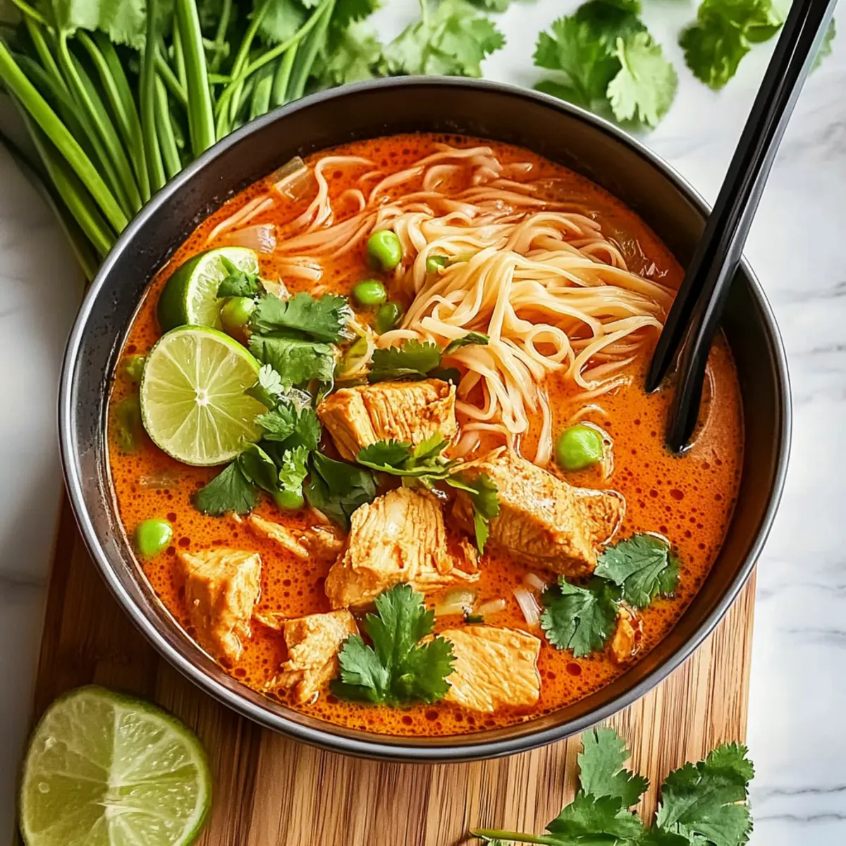 Ladle the Thai Red Curry Noodle Soup into bowls, making sure to include a good balance of chicken, noodles, and broth in each serving. Garnish with extra herbs if desired, and serve warm. This comforting dish will surely transport you to the heart of Thailand with every flavorful slurp!