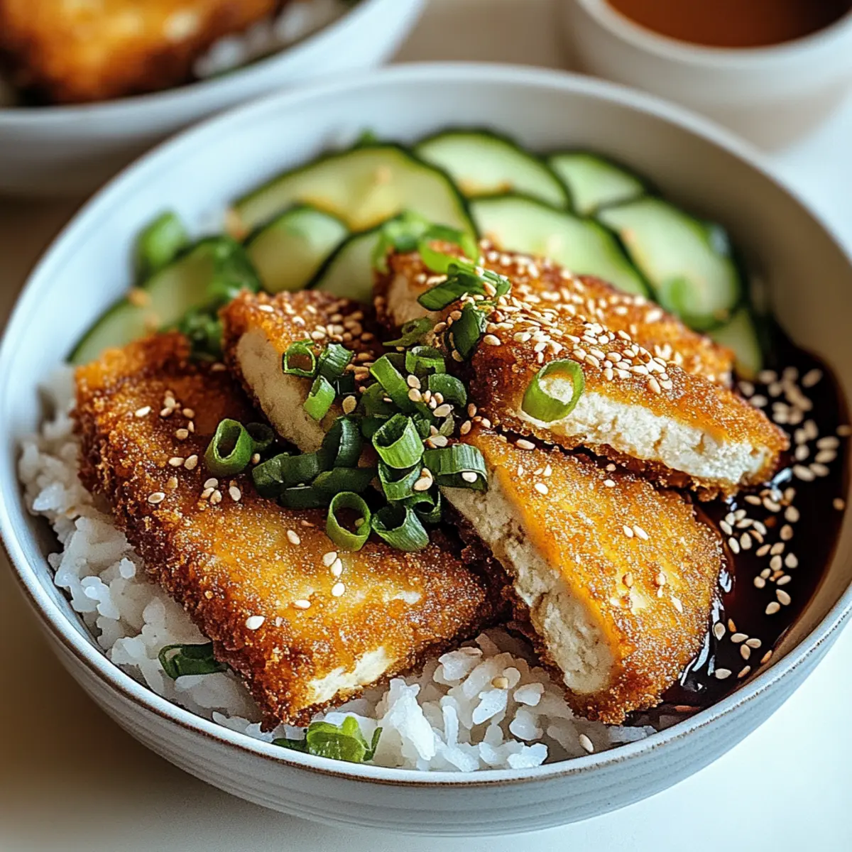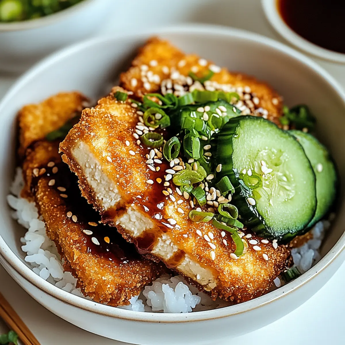 Fresh Cucumber Salad: A crisp salad with a vinegar dressing brings a refreshing contrast, balancing the richness of the katsu with a crunchy bite.