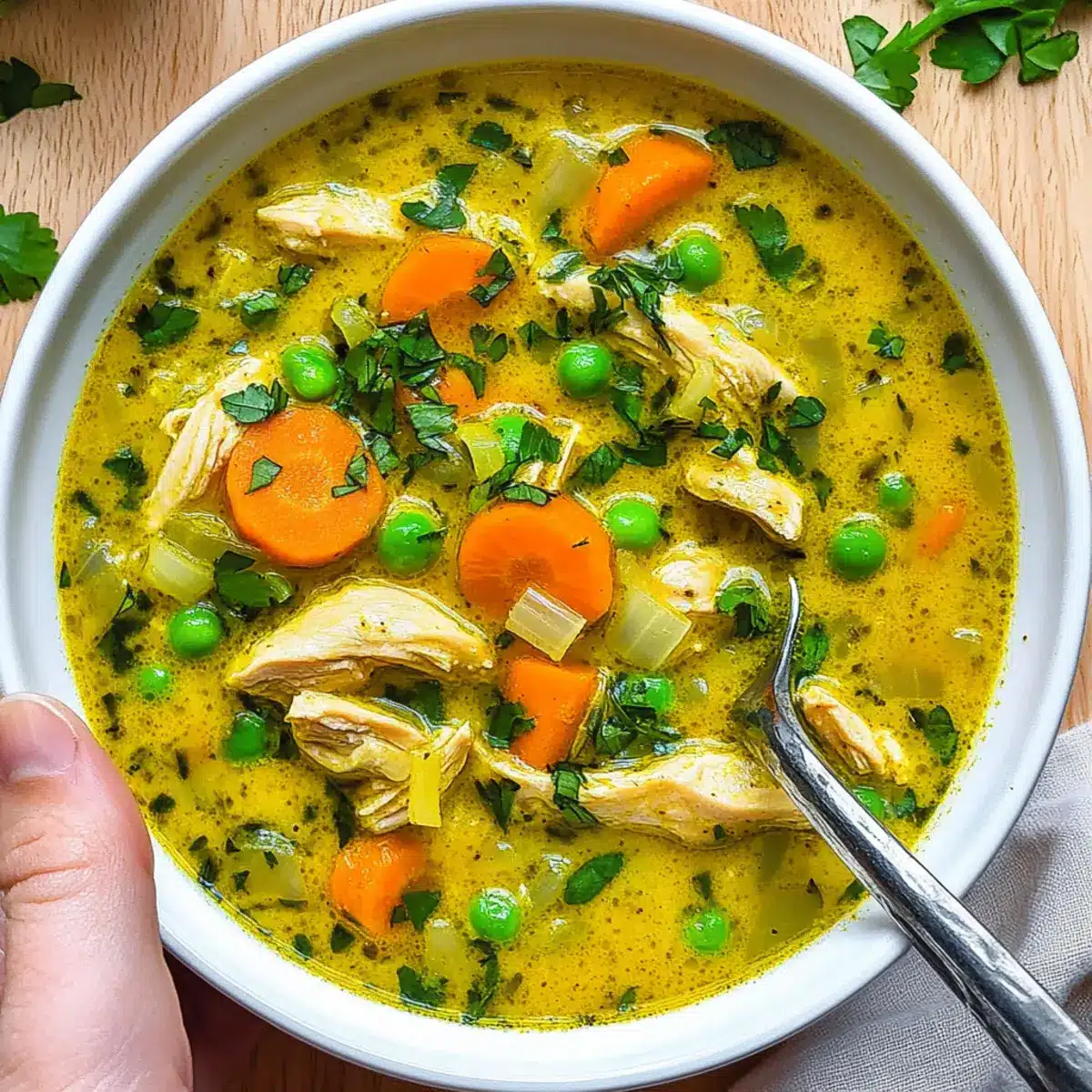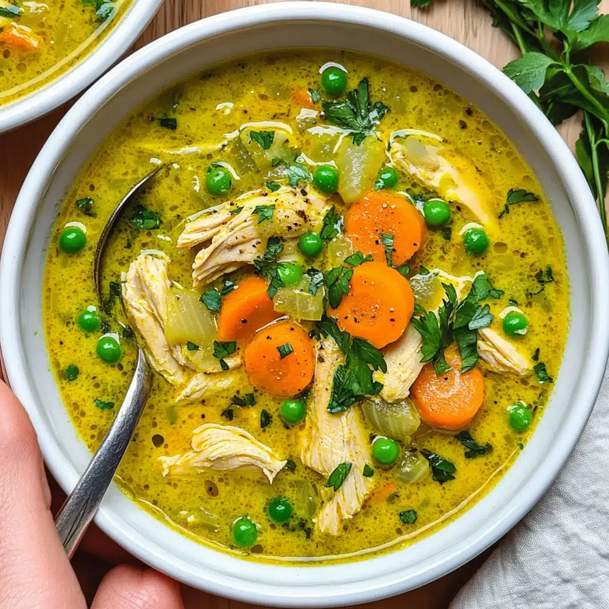 Once it reaches a simmer, lower the heat and stir in a can of coconut milk for creaminess, along with a cup of frozen peas. Allow the soup to cook for 10–15 minutes, or until the chicken is cooked through and tender. The vibrant color will be inviting as the flavors meld together.