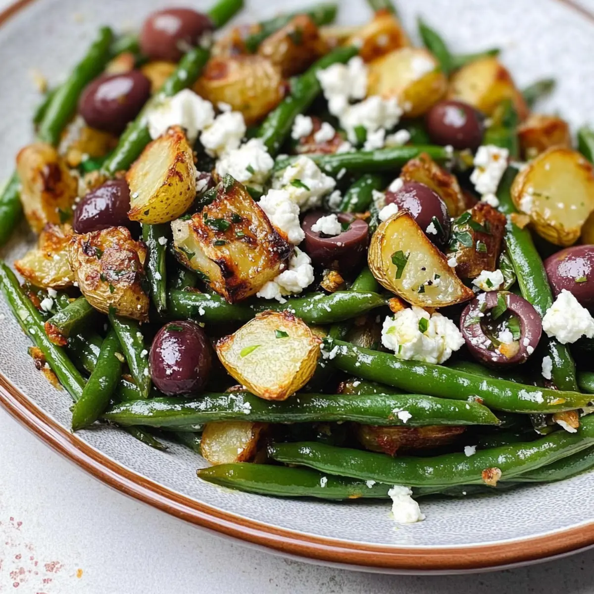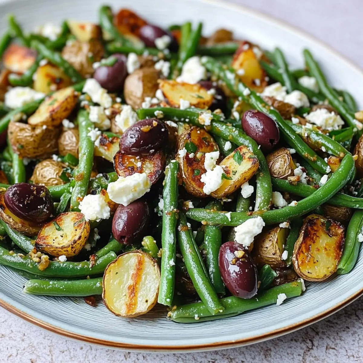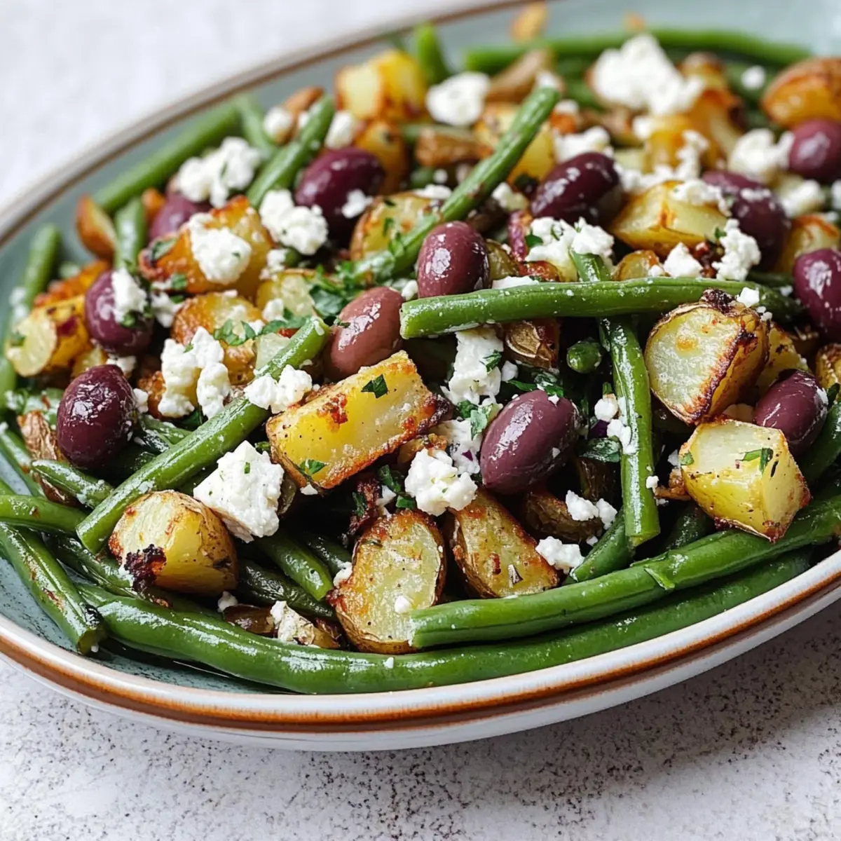 - On a platter, layer the blanched green beans, crispy potatoes, red onion, Kalamata olives, and feta cheese. Drizzle the dressing generously over the top and serve warm or at room temperature.