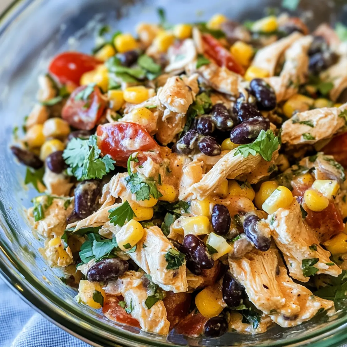 - In a large mixing bowl, combine the shredded chicken, corn kernels, black beans, diced tomatoes, chopped onions, and fresh cilantro. Gently toss to mix evenly.